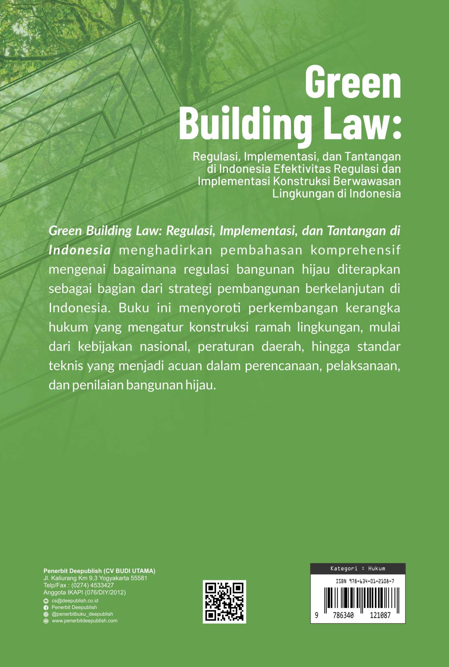 Buku Green Building Law: Regulasi, Implementasi, dan Tantangan di Indonesia Efektivitas Regulasi an Implementasi Konstruksi Berwawasan Lingkungan di Indonesia diterbitkan oleh Penerbit Buku Pendidikan Deepublish.