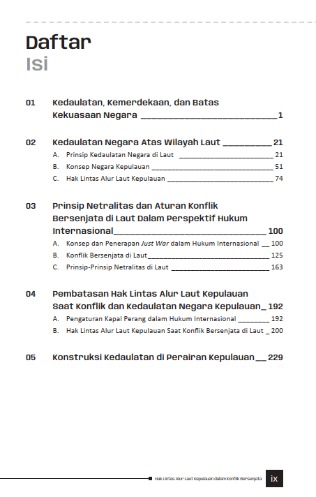 Situasinya menjadi lebih rumit saat konflik bersenjata terjadi. Aturan internasional saat ini menempatkan negara kepulauan pada posisi yang serba salah. Di satu sisi, prinsip netralitas menuntut kedaulatan mereka dihormati. Di sisi lain, mereka tetap diwajibkan membuka alur laut bagi kapal perang pihak yang berkonflik, bahkan ketika situasinya berpotensi mengancam keamanan wilayahnya sendiri. Buku ini membahas ketimpangan tersebut dengan lugas—menjelaskan bagaimana aturan yang ada belum sepenuhnya berpihak pada hak negara kepulauan untuk melindungi diri di tengah eskalasi konflik.