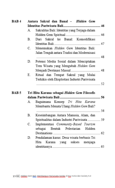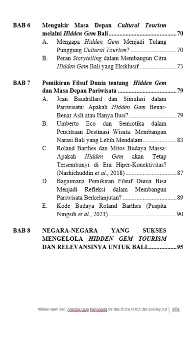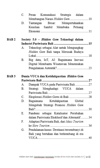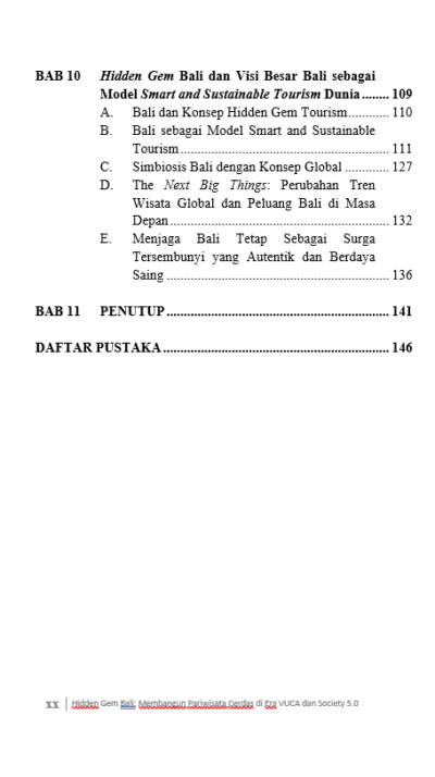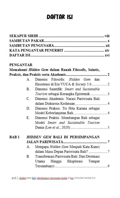 Berikut Daftar Isi Buku Pariwisata yang berjudul Buku Hidden Gem Bali: Membangun Pariwisata Cerdas di Era Vuca dan Society 5.0 (Peta Jalan Strategis Masa Depan Industri Pariwisata Bali Sebagai Smart and Sustainable Tourism), diantaranya: