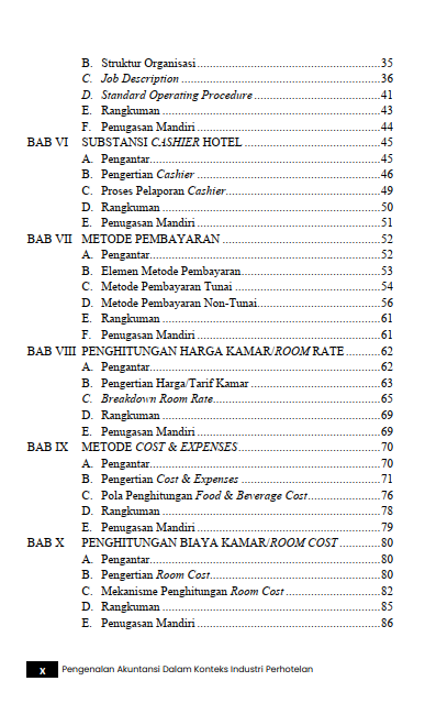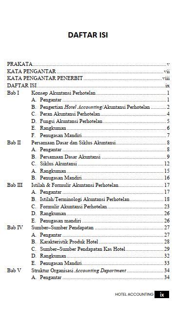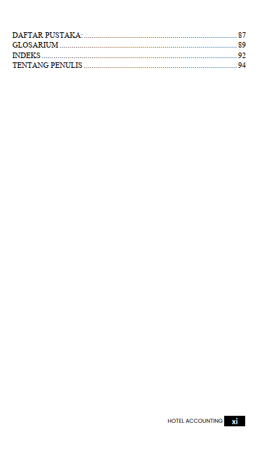 Sinopsis Buku Hotel Accounting Pengenalan Akuntansi dalam Konteks Industri Perhotelan Buku Hotel Accounting Pengenalan Akuntansi dalam Konteks Industri Perhotelan Buku Perhotelan yang berjudul Buku Hotel Accounting Pengenalan Akuntansi dalam Konteks Industri Perhotelan merupakan karya Yohanes Martono Widagdo. Industri perhotelan, sebagai salah satu pilar ekonomi yang terus bertumbuh, menuntut pengelolaan yang cermat dan strategis. Di tengah dinamika permintaan layanan perhotelan yang kian meningkat, akuntansi tampil sebagai kompas yang mengarahkan arah bisnis. Lebih dari sekadar pencatatan keuangan, akuntansi menjadi fondasi bagi manajemen hotel untuk memahami kesehatan finansial mereka. Dengan data yang akurat dan tepat waktu, para pengambil keputusan dapat merancang strategi yang efektif, mengoptimalkan kinerja, dan memastikan keberlanjutan bisnis. Penerapan sistem informasi akuntansi yang tepat menjadi kunci untuk mempercepat proses ini, menyajikan informasi yang relevan, dan mendukung pengambilan keputusan yang cerdas. Buku ini dirancang sebagai referensi bagi mahasiswa dan profesional yang ingin menguasai seluk-beluk akuntansi perhotelan. Dengan menggabungkan landasan teori yang kokoh dan aplikasi praktis yang relevan, buku ini menyajikan materi yang paling mutakhir, mencakup spektrum luas dari konsep dasar hingga teknik keuangan yang canggih. Setiap bab disusun dengan cermat, memberikan penjelasan mendalam tentang topik-topik penting, mulai dari pengenalan prinsip akuntansi hingga strategi pengelolaan keuangan yang kompleks. Dengan gaya penulisan yang lugas dan contoh-contoh yang mudah dipahami, buku ini membimbing pembaca untuk memahami bagaimana akuntansi menjadi alat yang sangat diperlukan dalam mengelola bisnis perhotelan yang dinamis dan kompetitif. Berikut Daftar Isi Buku Perhotelan yang berjudul Buku Hotel Accounting Pengenalan Akuntansi dalam Konteks Industri Perhotelan, diantaranya: