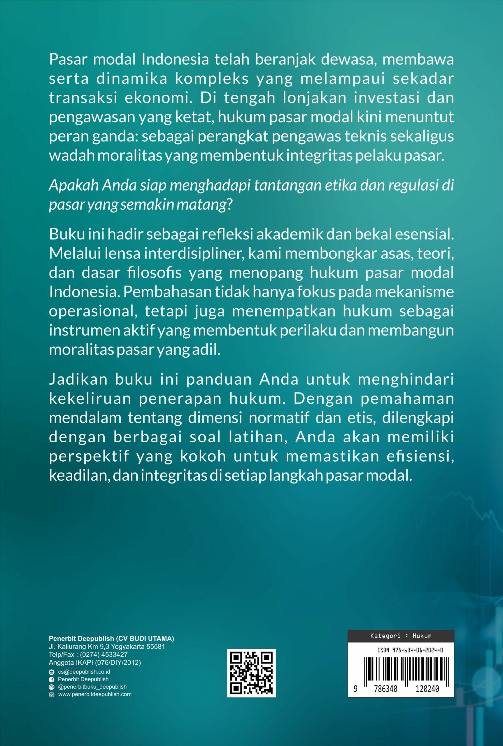 Buku Hukum Pasar Modal: Etika, Efisiensi, dan Keadilan dalam Regulasi Modern diterbitkan oleh Penerbit Buku Pendidikan Deepublish.