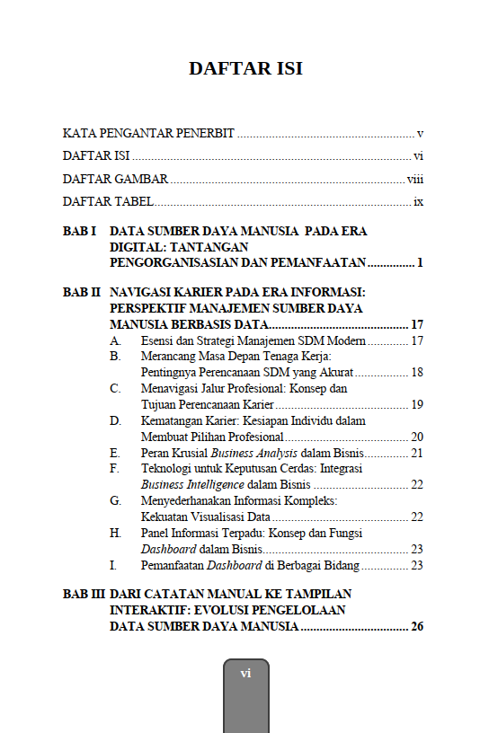 Berikut Daftar Isi Buku Manajemen SDM yang berjudul Buku Human Resource Analytics : Integrasi Power BI dalam Pengambilan Keputusan SDM Melalui Dashboarding, diantaranya: