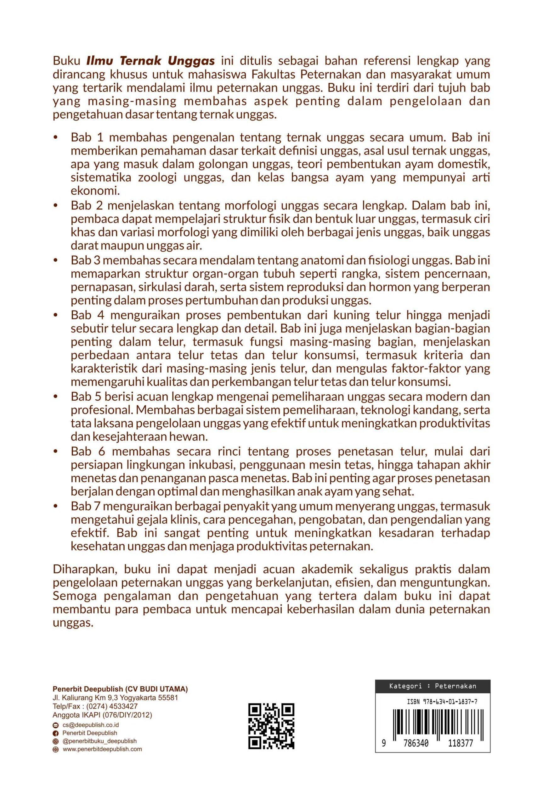 Buku ini mengupas tuntas sistematika berbagai jenis unggas (ayam, itik, puyuh), lalu menjelaskan detail morfologi, anatomi, dan fisiologi tubuh, termasuk proses krusial pembentukan telur, lengkap dengan metode penetasan modern dan alami pada unggas tersebut. Selain itu, buku ini juga membahas pengetahuan komprehensif tentang pencegahan dan penanganan puluhan jenis penyakit unggas—mulai dari infeksi virus mematikan seperti tetelo dan flu burung, hingga penyakit yang disebabkan oleh defisiensi nutrisi. Diharapkan, Buku Ilmu Ternak Unggas ini dapat menjadi acuan akademik sekaligus praktis dalam pengelolaan peternakan unggas yang berkelanjutan, efisien, dan menguntungkan. Semoga pengalaman dan pengetahuan yang tertera dalam buku ini dapat membantu para pembaca untuk mencapai keberhasilan dalam dunia peternakan unggas.
