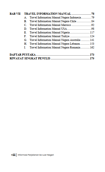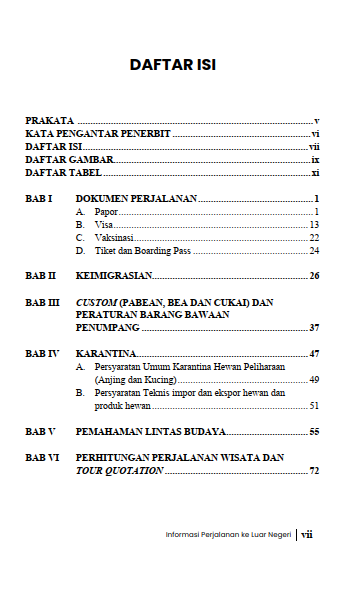 Informasi Perjalanan ke Luar Negeri merupakan sumber wawasan mendalam yang dirancang untuk membantu pembaca memahami seluk-beluk perjalanan internasional secara menyeluruh. Buku ini mengulas berbagai aspek penting, mulai dari perencanaan perjalanan, pengurusan paspor dan visa, persiapan kesehatan, hingga pengaturan anggaran dan akomodasi. Pembaca juga dibekali pemahaman mengenai aturan keimigrasian, keamanan perjalanan, serta etika dan budaya di berbagai negara tujuan agar mampu beradaptasi dengan lingkungan baru.
