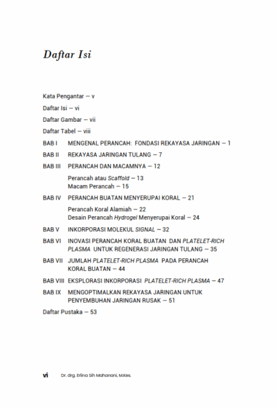Perancah merupakan lingkungan mikro yang sangat penting untuk regenerasi tulang, tetapi setelah sel dapat menghasilkan matriks ekstraseluler dan tulang baru mulai terbentuk, maka perancah harus dapat terdegradasi tanpa meninggalkan sisa. Buku yang berjudul Inkorporasi Platelet Rich Plasma pada Perancah Koral Buatan ini terdiri atas sembilan bab, disusun guna memberikan informasi meliputi perancah sebagai fondasi rekayasa jaringan, rekayasa jaringan tulang, perancah dan macamnya, perancah buatan menyerupai koral, inkorporasi molekul signal, inovasi perancah koral buatan dan platelet-rich plasma untuk regenerasi jaringan tulang, jumlah platelet-rich plasma pada perancah koral buatan, eksplorasi inkorporasi platelet-rich plasma, hingga mengoptimalkan rekayasa jaringan untuk penyembuhan jaringan rusak.