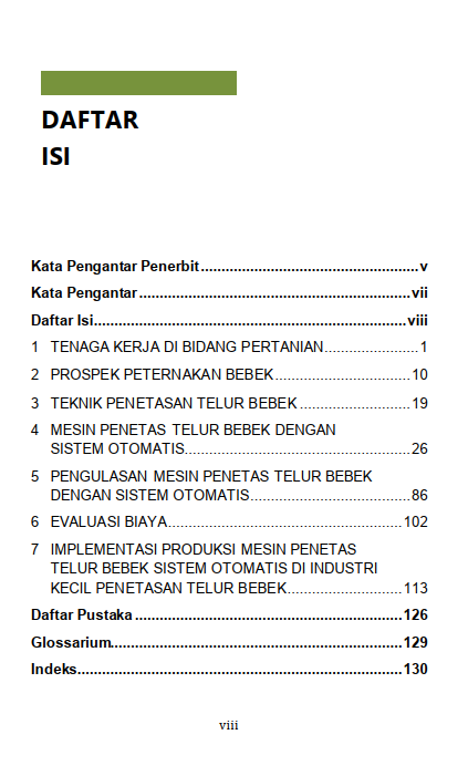 Inti buku ini memberikan pemahaman mendalam tentang teknologi mesin penetas telur bebek otomatis. Hal tersebut juga mencakup prinsip-prinsip kerja dan spesifikasi mesin, sehingga pembaca bisa memahami cara mengadopsi teknologi ini dalam operasi mereka. Buku ini cocok bagi mereka yang ingin sekadar belajar atau mau meningkatkan efisiensi dan produktivitas dalam penetasan telur bebek serta memahami potensi bisnis di industri peternakan bebek.