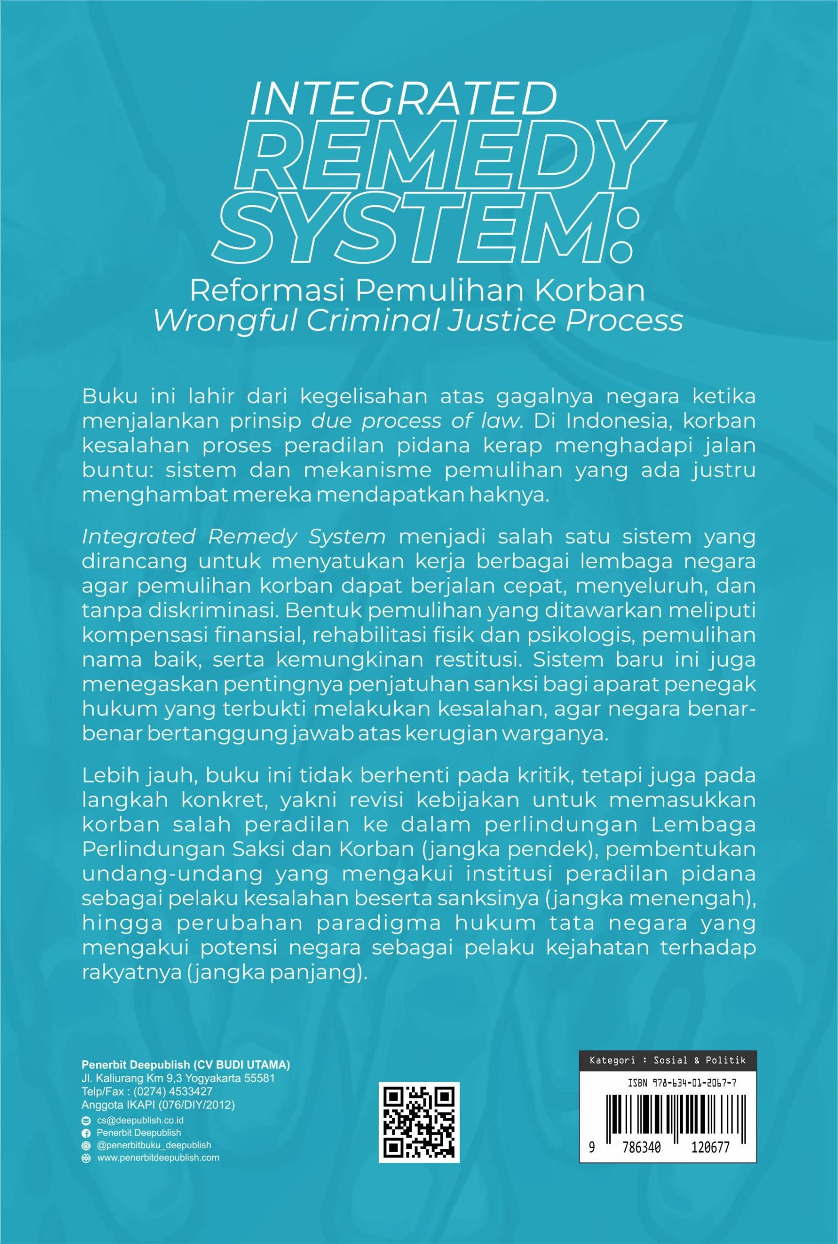 Buku Integrated Remedy System: Reformasi Pemulihan Korban Wrongful Criminal Justice Process diterbitkan oleh Penerbit Buku Pendidikan Deepublish.