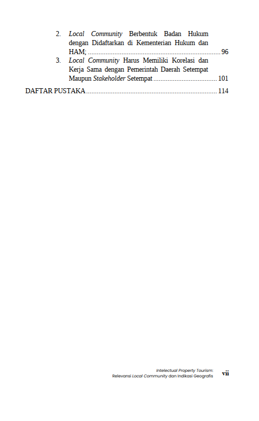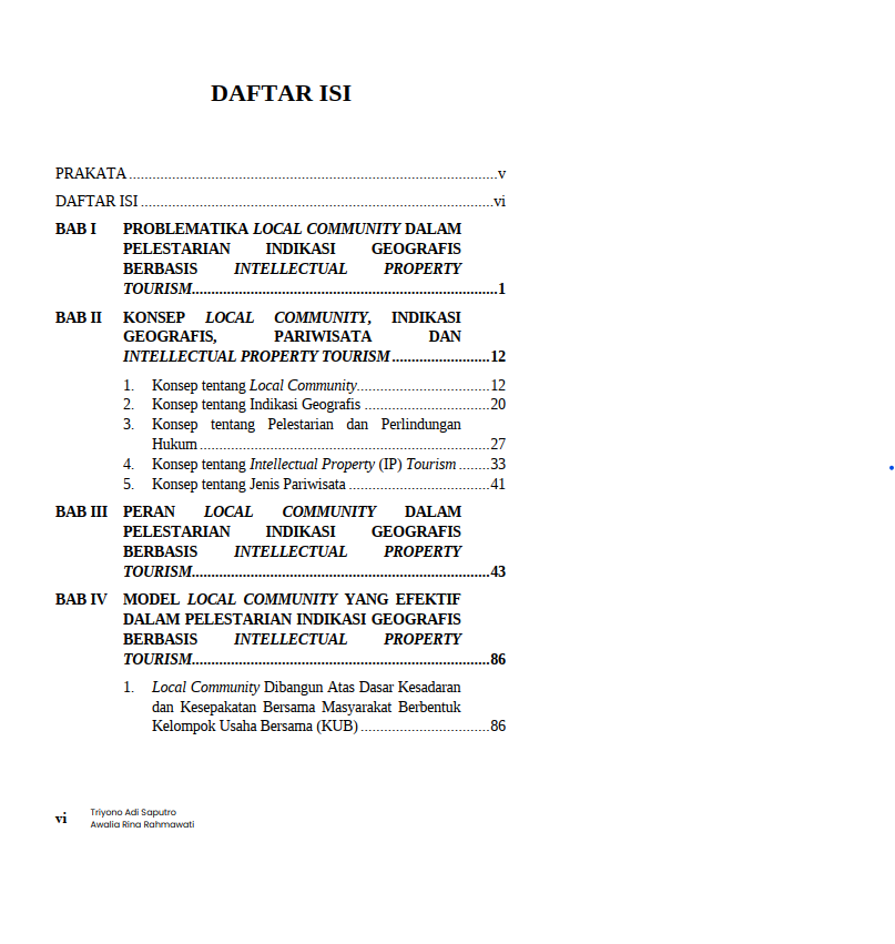 Berikut Daftar Isi Buku Pariwisata yang berjudul Buku Intelectual Property Tourism: Relevansi Local Community dan Indikasi Geografis, diantaranya: