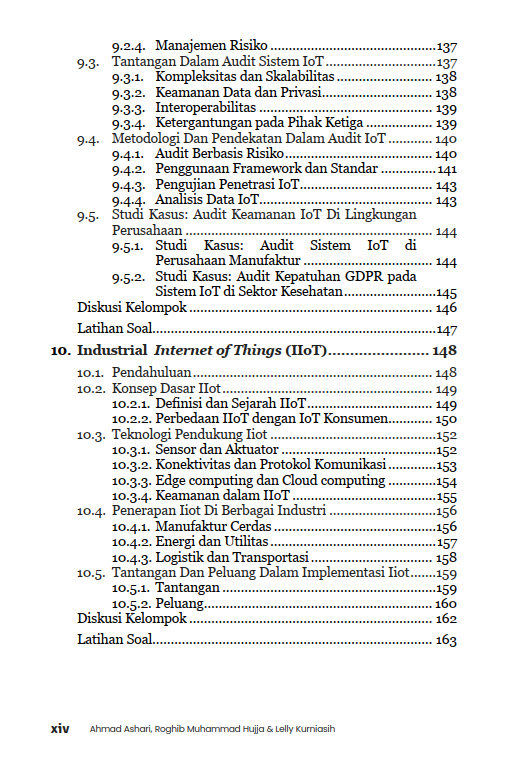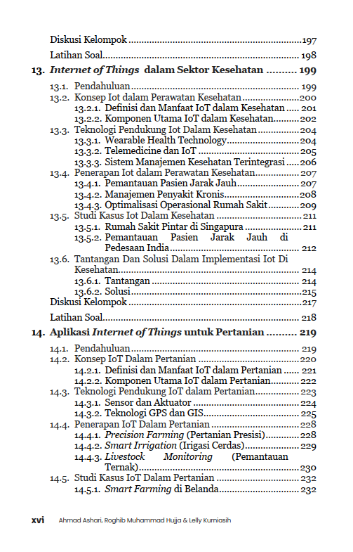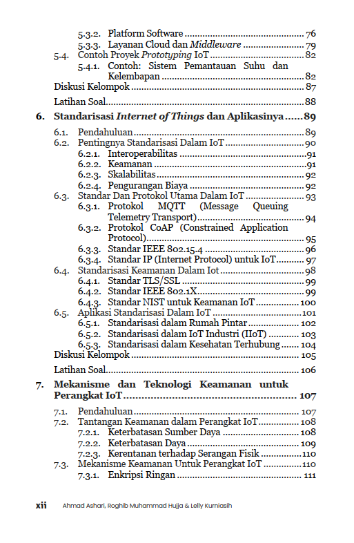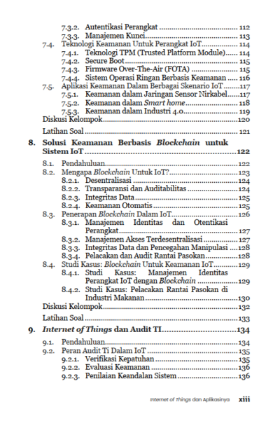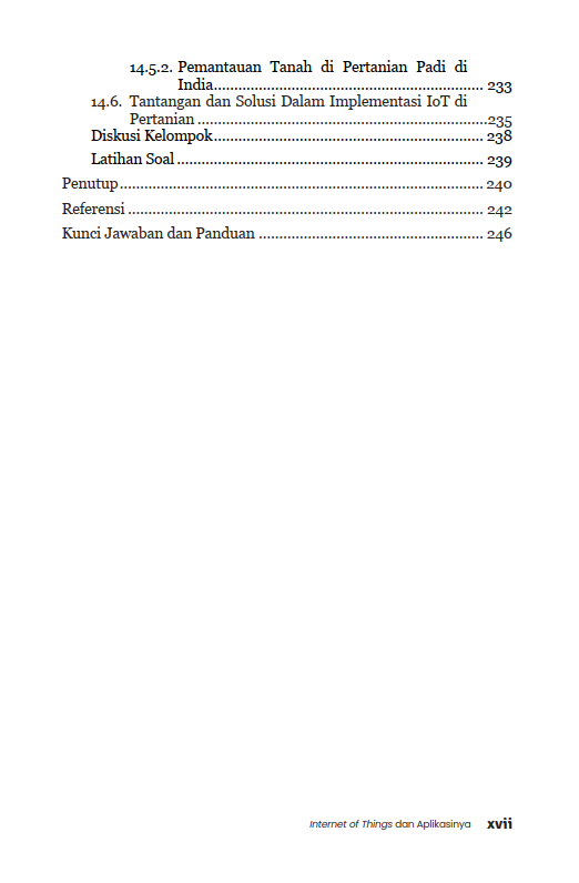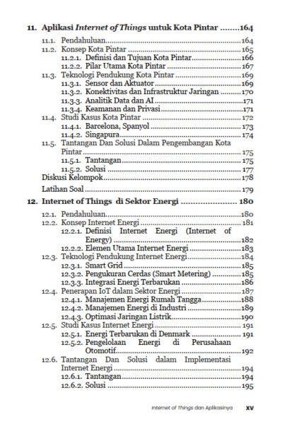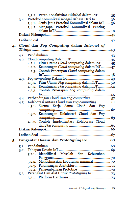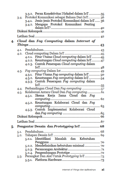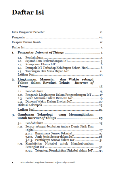 Dengan meningkatnya peran IoT dalam transformasi digital global, sangat penting bagi para profesional, akademisi, dan pembuat kebijakan untuk memahami teknologi ini secara mendalam. Buku ini tidak hanya bertujuan untuk memperkenalkan pembaca pada aspek teknis IoT, tetapi juga untuk membekali mereka dengan wawasan yang dapat diimplementasikan dalam kehidupan nyata. Kami berharap pembaca dapat menggunakan pengetahuan yang disampaikan untuk mengoptimalkan proses bisnis, meningkatkan efisiensi, dan mendukung inovasi teknologi di berbagai bidang. Berikut Daftar Isi Buku Teknik Informatika berjudul Buku Internet of Things dan Aplikasinya Menghubungkan Dunia Fisik dan Digital untuk Kehidupan yang Lebih Cerdas, diantaranya: