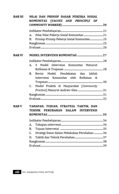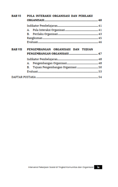 Sinopsis Buku Intervensi Pekerjaan Sosial di Tingkat Komunitas dan Organisasi Buku Intervensi Pekerjaan Sosial di Tingkat Komunitas dan Organisasi Buku Sosiologi yang berjudul Buku Intervensi Pekerjaan Sosial di Tingkat Komunitas dan Organisasi merupakan karya Novi Hendrika Jaya Putra. Dalam buku ajar ini terbagi dalam dua materi, yaitu intervensi komunitas dalam perspektif teori dan model implementatifnya, serta peran, tugas, dan keterampilan community worker serta taktik dan strateginya. Bagian kedua yaitu intervensi organisasi meliputi pola interaksi organisasi, perilaku organisasi, pengembangan organisasi, serta penilaian kapasitas organisasi. Intervensi pada komunitas merupakan satu metode perubahan yang ditujukan untuk memberdayakan komunitas dan memungkinkan komunitas untuk mengembangkan kapasitasnya bagi peningkatan keberfungsian sosial mereka dengan melakukan serangkaian kegiatan pemberdayaan yang diinginkan oleh pelaku perubahan dan penerima layanan perubahan. Kegiatan intervensi sosial ditujukan bagi upaya meningkatkan kapasitas masyarakat, baik itu peningkatan kapasitas pengetahuan, kapasitas keterampilan, dan kapasitas nilai atau values klien dalam hal ini komunitas atau masyarakat. Terdapat banyak istilah berkenaan dengan intervensi komunitas yang sering dipahami dan digunakan di berbagai negara. Berikut Daftar Isi Buku Sosiologi yang berjudul Buku Intervensi Pekerjaan Sosial di Tingkat Komunitas dan Organisasi, diantaranya: