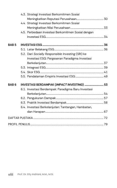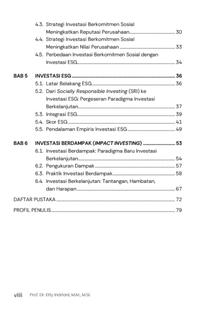 Sinopsis Buku Investasi Berkelanjutan: Paradigma Baru Menuju SDGs Buku Investasi Berkelanjutan: Paradigma Baru Menuju SDGs Buku Manajemen berjudul Buku Investasi Berkelanjutan: Paradigma Baru Menuju SDGs merupakan karya Etty Indriani. Investasi berkelanjutan berevolusi mulai dari Investasi Bertanggung Jawab Sosial (Socially Responsible Investing), ESG Investing, dan Investasi Berdampak (impact investing). Investasi ESG menjadi fondasi untuk mengintegrasikan pertimbangan etis dan berkelanjutan ke dalam keputusan investasi, terutama berfokus pada evaluasi kinerja perusahaan di area-area krusial: keberlanjutan lingkungan hidup (E), tanggung jawab sosial (S), dan tata kelola perusahaan (G). Meskipun kriteria ESG berfungsi untuk memitigasi risiko dan menyelaraskan investasi dengan nilai-nilai, penekanan utamanya sering kali terletak pada menghindari bahaya daripada mendorong perubahan substansial. Namun, investasi berdampak mengambil sikap proaktif. Investasi berdampak tidak hanya memenuhi kriteria ESG, tetapi juga menghasilkan hasil sosial dan lingkungan yang terukur dan positif. Pergeseran dari “Menghindari Kerugian (Avoiding Harm)” menjadi “Menciptakan Perubahan Positif (Creating Positive Change)” sangatlah penting karena hal ini tidak hanya sekadar menjauhi praktik-praktik yang merugikan, tetapi juga secara aktif berpartisipasi dalam mengatasi tantangan-tantangan yang paling mendesak di dunia. Buku ini dilengkapi dengan ulasan teori tentang konsep Investasi berkelanjutan, pendalaman empiris yang mempertajam pembahasan, dan praktik impact investing yang mempunyai dampak positif dan terukur pada microfinance dan modal ventura. Berikut Daftar Isi Buku Manajemen berjudul Buku Investasi Berkelanjutan: Paradigma Baru Menuju SDGs, diantaranya: