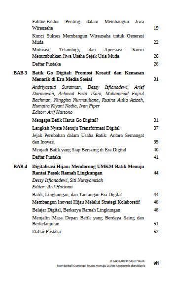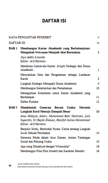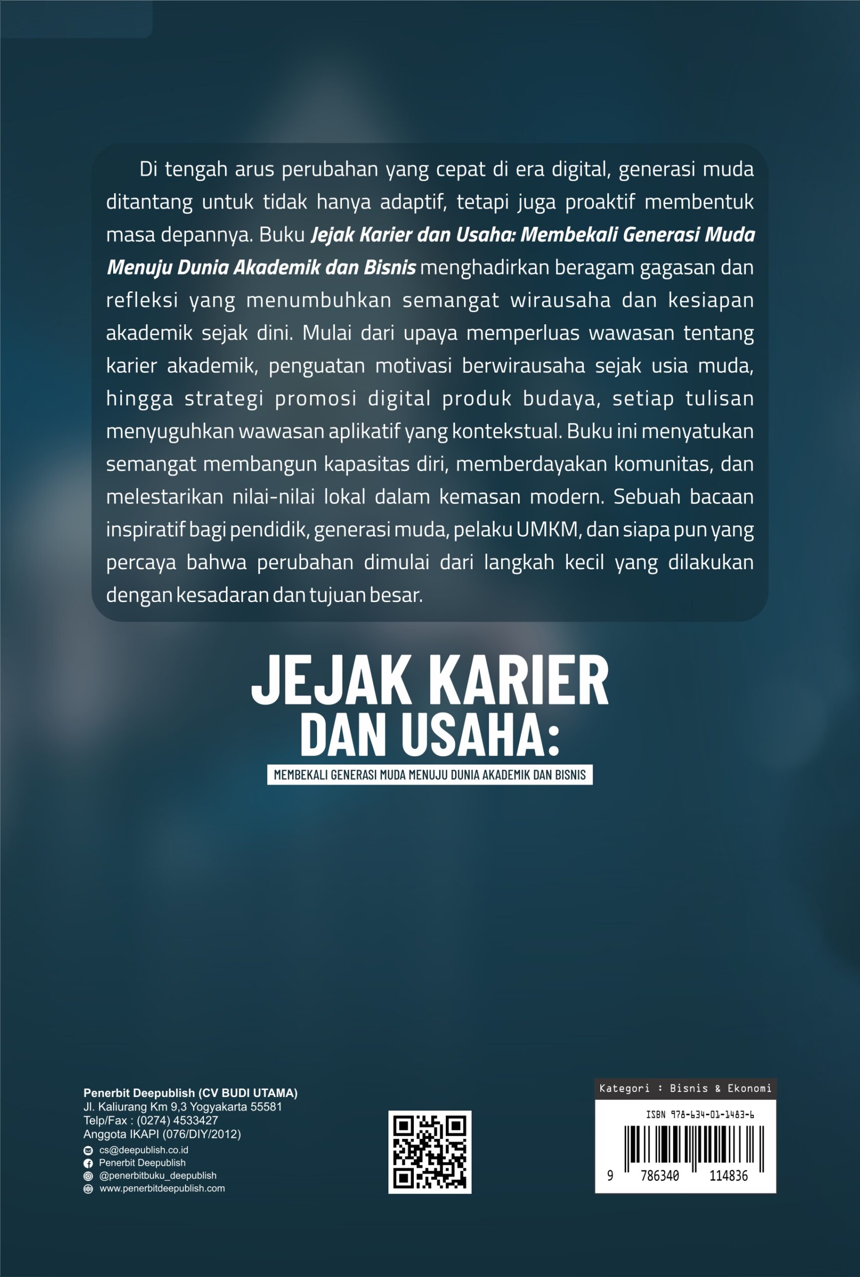 Sinopsis Buku Jejak Karier dan Usaha: Membekali Generasi Muda Menuju Dunia Akademik dan Bisnis Buku Jejak Karier dan Usaha: Membekali Generasi Muda Menuju Dunia Akademik dan Bisnis Buku Bisnis yang berjudul Buku Jejak Karier dan Usaha: Membekali Generasi Muda Menuju Dunia Akademik dan Bisnis merupakan karya Jaya Addin Linando, dkk. Menumbuhkan jiwa kewirausahaan di kalangan pelajar merupakan langkah strategis dalam membentuk generasi muda yang adaptif, cerdas, dan mandiri dalam menghadapi berbagai tantangan kehidupan. Dalam rangka menumbuhkan minat dan semangat kewirausahaan di kalangan pelajar, khususnya di wilayah Kota Yogyakarta, dibutuhkan pendekatan pendidikan dan pembinaan yang terintegrasi. Pendekatan ini dapat dilakukan melalui pembelajaran di ruang kelas serta kegiatan praktik langsung di lapangan, seperti produksi barang yang memiliki nilai jual. Di tengah arus perubahan yang cepat di era digital, generasi muda ditantang untuk tidak hanya adaptif, tetapi juga proaktif membentuk masa depannya. Buku ini menghadirkan beragam gagasan dan refleksi yang menumbuhkan semangat wirausaha dan kesiapan akademik sejak dini. Mulai dari upaya memperluas wawasan tentang karier akademik, penguatan motivasi berwirausaha sejak usia muda, hingga strategi promosi digital produk budaya, setiap tulisan menyuguhkan wawasan aplikatif yang kontekstual. Buku ini menyatukan semangat membangun kapasitas diri, memberdayakan komunitas, dan melestarikan nilai-nilai lokal dalam kemasan modern. Buku Jejak Karier dan Usaha: Membekali Generasi Muda Menuju Dunia Akademik dan Bisnis sangat cocok bagi pendidik, generasi muda,pelaku UMKM, dan siapapun yang percaya bahwa perubahan dimulai dari langkah kecil yang dilakukan dengan kesadaran dan tujuan besar. Berikut Daftar Isi Buku Bisnis yang berjudul Buku Jejak Karier dan Usaha: Membekali Generasi Muda Menuju Dunia Akademik dan Bisnis, diantaranya: