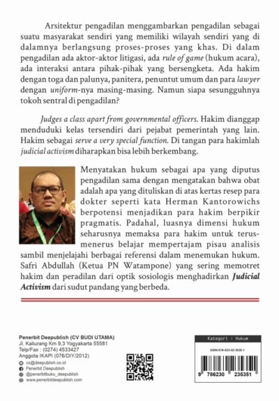 Buku Hukum yang berjudul Judicial Activism: Edisi Revisi merupakan karya Safri Abdullah. Arsitektur pengadilan menggambarkan pengadilan sebagai suatu masyarakat sendiri yang memiliki wilayah sendiri yang di dalamnya berlangsung proses-proses yang khas. Di dalam pengadilan ada aktor-aktor litigasi, ada rule of game (hukum acara), ada interaksi antara pihak-pihak yang bersengketa. Ada hakim dengan toga dan palunya, panitera, penuntut umum dan para lawyer dengan uniformnya masing-masing. Namun siapa sesungguhnya tokoh sentral di pengadilan?