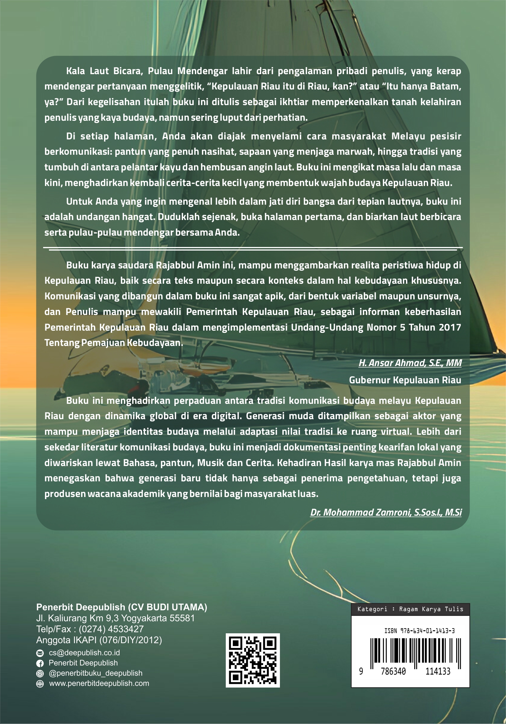 Buku Kala Laut Bicara, Pulau Mendengar Jalinan Makna dalam Komunikasi Budaya di Bumi Segantang Lada diterbitkan oleh Penerbit Buku Pendidikan Deepublish.
