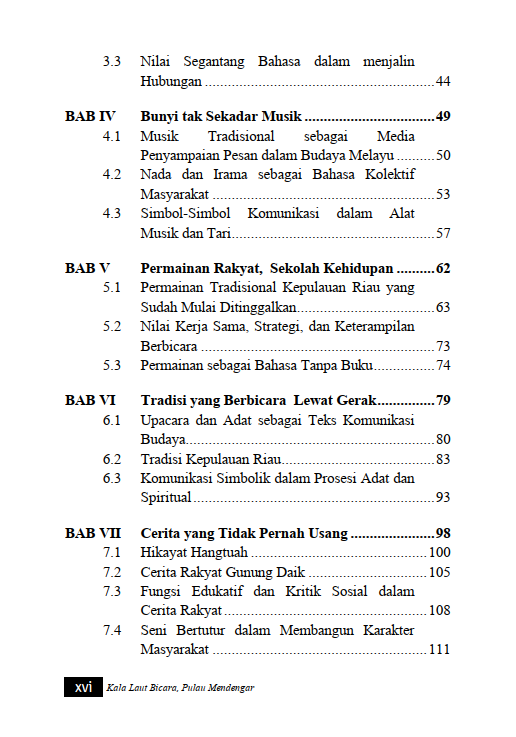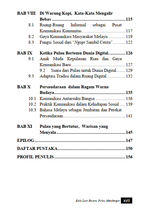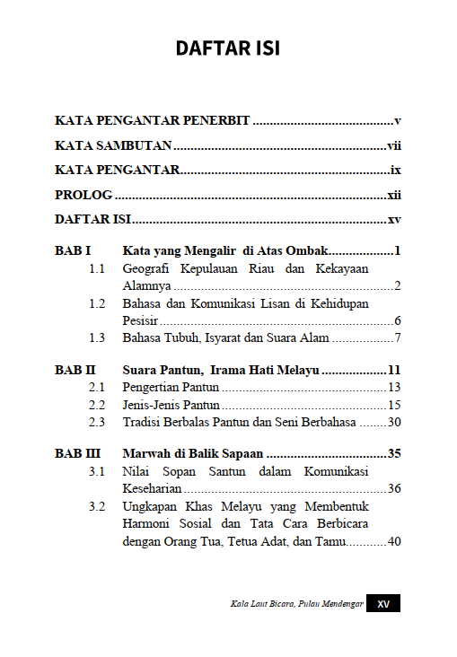 Berikut Daftar Isi Buku Sosial Budaya yang berjudul Buku Kala Laut Bicara, Pulau Mendengar Jalinan Makna dalam Komunikasi Budaya di Bumi Segantang Lada, diantaranya: