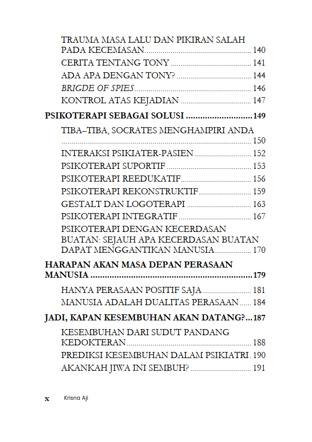 Buku Psikologi yang berjudul Buku Kapan Jiwa Ini Akan Sembuh? Filsafat Sederhana Tentang Kesembuhan Jiwa merupakan karya Krisna Aji. Pertanyaan “Kapan jiwa ini akan sembuh?” merupakan gema sunyi yang pernah melintas di dalam relung hati banyak orang. Relung hati yang bergulat dengan luka dan keletihan jiwa yang tak tampak dari luar.