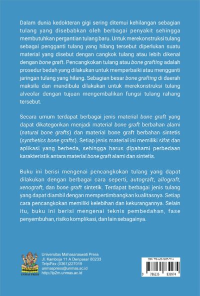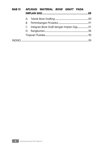 Buku Kedokteran Gigi berjudul Buku Karakteristik Bone Graft Dan Penggunaannya Di Kedokteran Gig merupakan karya Mochammad Taha Ma’ruf. Dalam dunia kedokteran gigi sering ditemui kehilangan sebagian tulang yang disebabkan oleh berbagai penyakit sehingga membutuhkan pergantian tulang baru. Untuk merekonstruksi tulang sebagai pengganti tulang yang hilang tersebut diperlukan suatu material yang disebut dengan cangkok tulang atau lebih dikenal dengan bone graft. Pencangkokan tulang atau bone grafting adalah prosedur bedah yang dilakukan untuk memperbaiki atau mengganti jaringan tulang yang hilang. Sebagian besar bone grafting di daerah maksila dan mandibula dilakukan untuk merekonstruksi tulang alveolar dengan tujuan mengembalikan fungsi tulang rahang tersebut. Secara umum terdapat berbagai jenis material bone graft yang dapat dikategorikan menjadi material bone graft berbahan alami (natural bone grafts) dan material bone graft berbahan sintetis (synthetics bone grafts). Setiap jenis material ini memiliki sifat dan aplikasi yang berbeda, sehingga harus dipahami perbedaan karakteristik antara material bone graft alami dan sintetis.