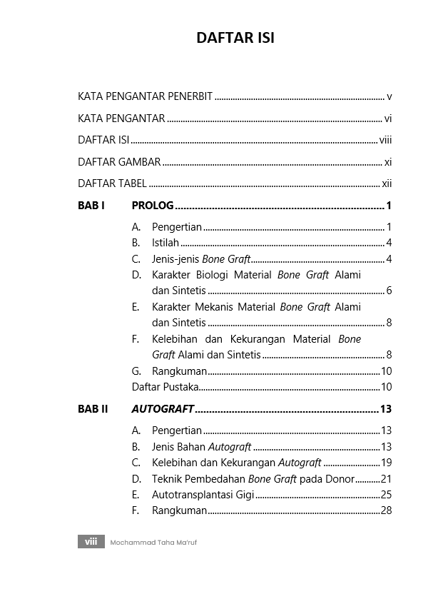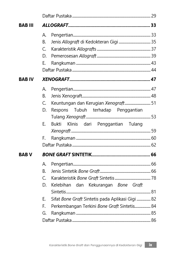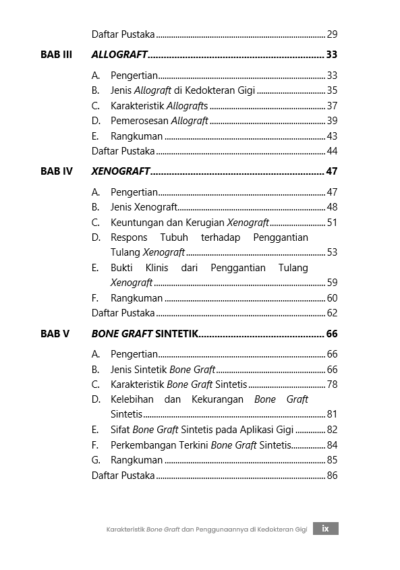 Berikut Daftar Isi Buku Kedokteran Gigi berjudul Buku Karakteristik Bone Graft Dan Penggunaannya Di Kedokteran Gigi, diantaranya: