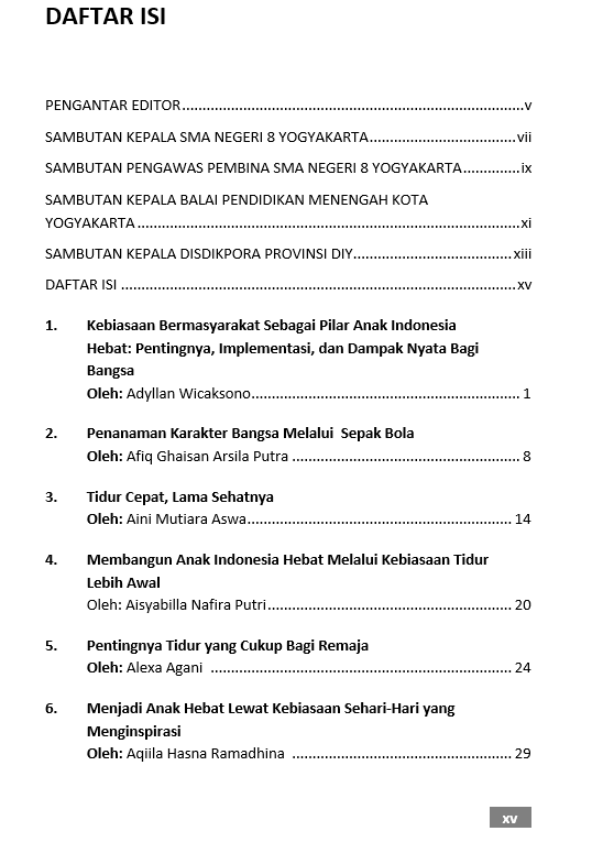 Buku ini bukan sekadar teori, melainkan peta jalan praktis yang menggabungkan kesehatan fisik, kecerdasan sosial, dan integritas moral. Jika Anda mendambakan generasi yang kuat, sehat, berprestasi, dan siap memimpin, inilah manual yang wajib dimiliki. Buku Kebiasaan Positif Membentuk Karakter Unggul ini diharapkan dapat menjadi inspirasi para siswa yang lain untuk selalu menulis searah dengan program literasi yang digaungkan oleh SMA Negeri 8 Yogyakarta. Buku ini cocok dibaca oleh siswa, guru, pemerhati pendidikan dan umum.