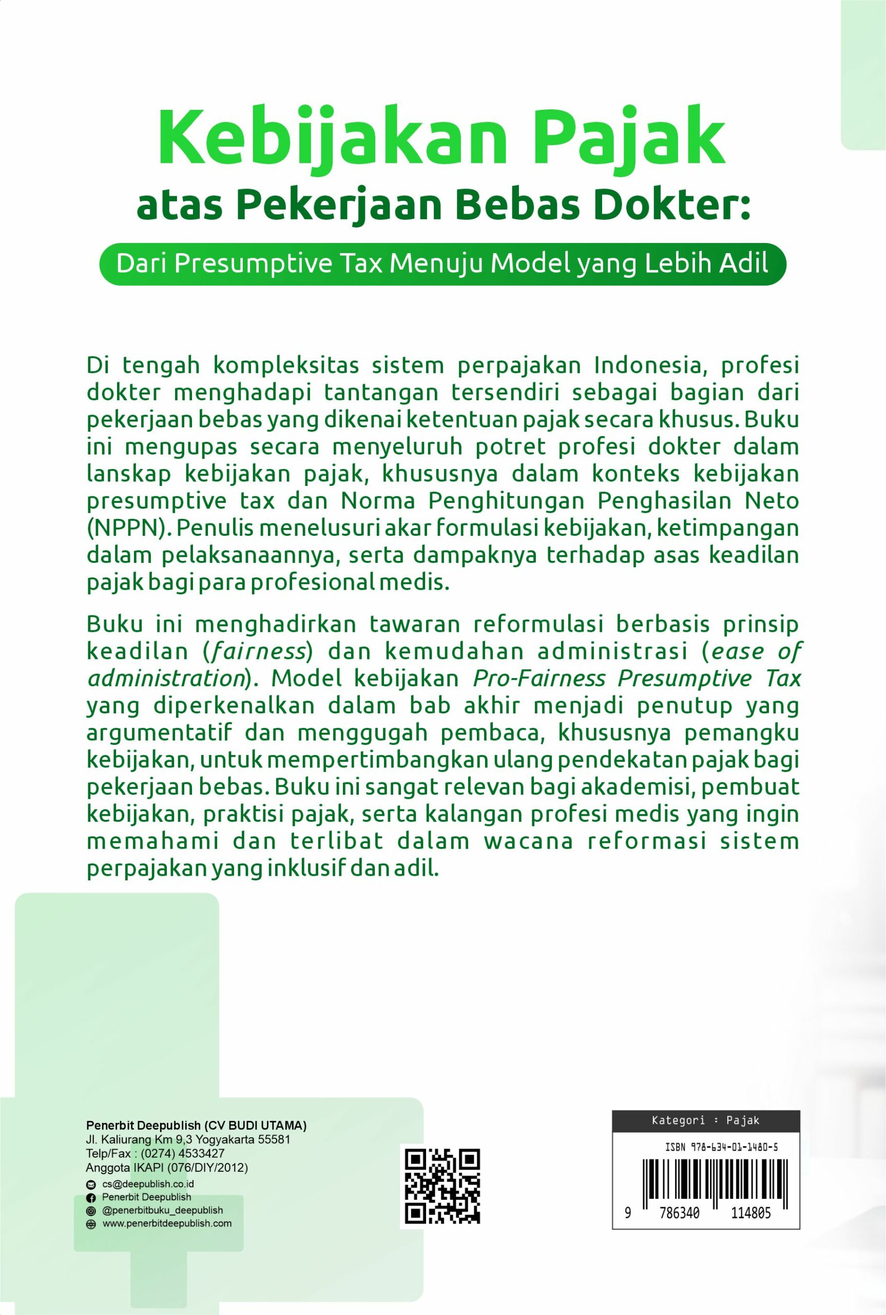 Buku Kebijakan Pajak Atas Pekerjaan Bebas Dokter: Dari Presumptive Tax Menuju Model yang Lebih Adil diterbitkan oleh Penerbit Buku Pendidikan Deepublish.