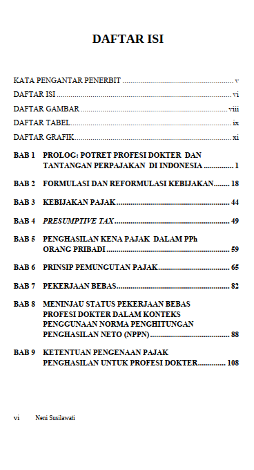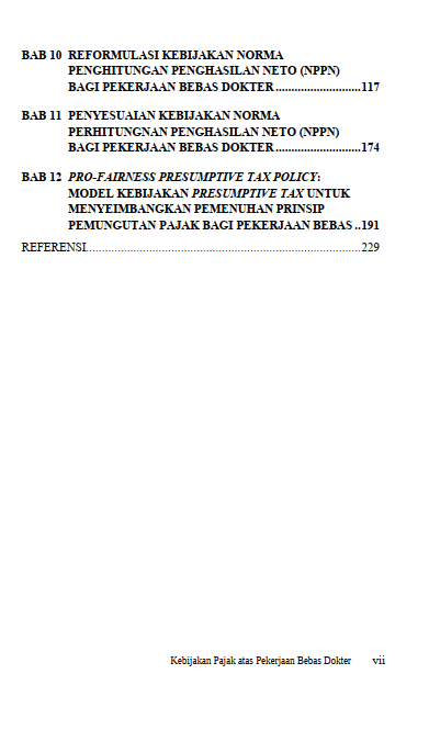 Berikut Daftar Isi Buku Perpajakan yang berjudul Buku Kebijakan Pajak Atas Pekerjaan Bebas Dokter: Dari Presumptive Tax Menuju Model yang Lebih Adil, diantaranya: