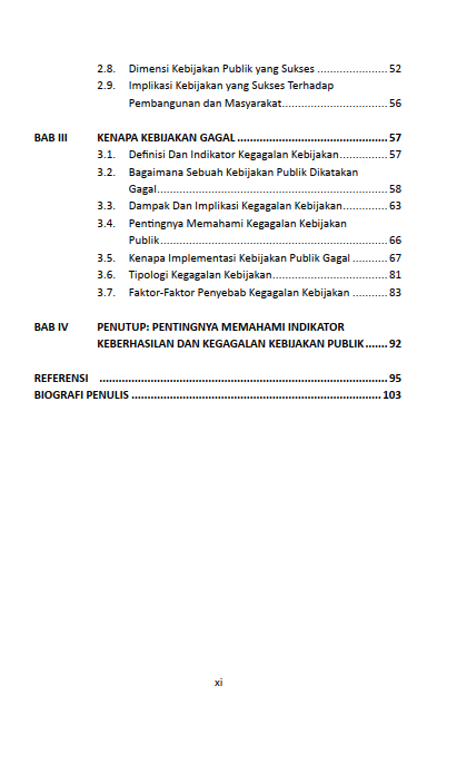 Kebijakan publik tidak hanya soal rumusan aturan, tetapi juga proses politik, sosial, ekonomi, dan birokrasi yang menyertainya. Penting bagi siapapun untuk memahami seperti apa sebuah kebijakan dikatakan sukses dan seperti apa sebuah kebijakan itu dikatakan gagal. Dengan memahami indikator tersebut maka dalam menilai sebuah kebijakan pembangunan yang dilaksanakan oleh pemerintah akan lebih objektif karena penilaiannya didasarkan pada indikator-indikator kebijakan publik yang sukses dan kebijakan publik yang gagal. Buku ini menjawab bagaimana sebuah kebijakan publik dikatakan sukses dan pada konteks mana dikatakan gagal.