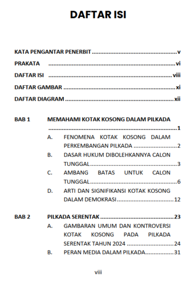 Buku sosial politik ini merupakan karya Heri Suheri. Sejarah kotak kosong dalam pilkada bukan hanya terjadi pada pilkada serentak tahun 2024 ini saja. Pilkada tahun 2018 juga terdapat daerah, kandidat pasangan calon, terpaksa melawan kotak kosong, contohnya pada pilkada Makassar. Konsep kotak kosong menjadi relevan ketika terjadi situasi hanya satu pasangan calon yang mendaftar dan memenuhi syarat untuk berpartisipasi dalam pilkada. Situasi ini dapat disebabkan oleh berbagai faktor, termasuk dominasi partai politik tertentu, kurangnya oposisi yang kuat, atau kesepakatan politik tertentu yang menghalangi kemunculan kandidat alternatif.