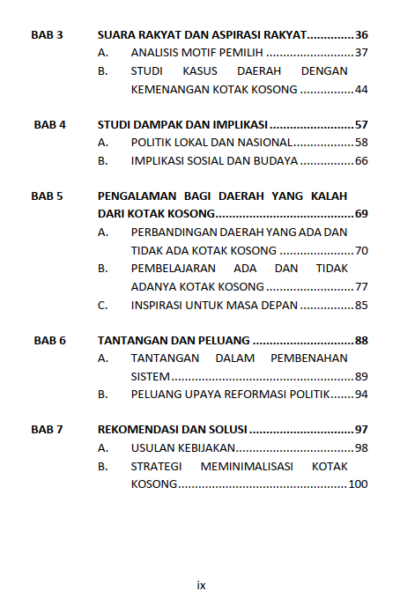 Buku ini memuat tentang fenomena kemenangan kotak kosong dalam Pilkada Serentak 2024 sebagai bentuk protes diam rakyat terhadap sistem politik yang masih perlu diperbaiki. Fenomena ini mencerminkan meningkatnya kesadaran kritis masyarakat dalam memilih pemimpin yang benar-benar merepresentasikan aspirasi mereka. Melalui buku ini diungkapkan dampak politik lokal dan nasional dari kemenangan kotak kosong serta implikasinya bagi demokrasi Indonesia.
