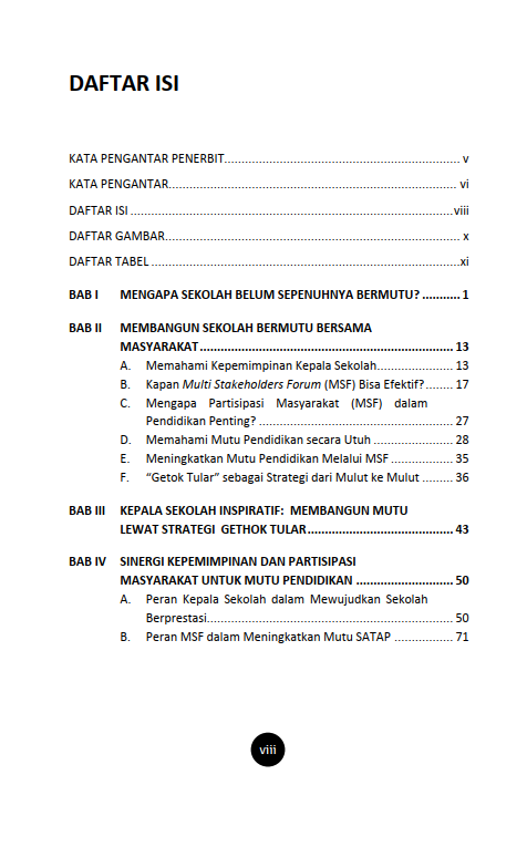 Berikut Daftar Isi Buku Keguruan dan Ilmu Pendidikan yang berjudul Buku Kepemimpinan Kepala Sekolah yang Memberdayakan: Intervensi Terhadap Peran Forum Masyarakat Jamak Melalui Kearifan Budaya Lokal Getok Tular, diantaranya: