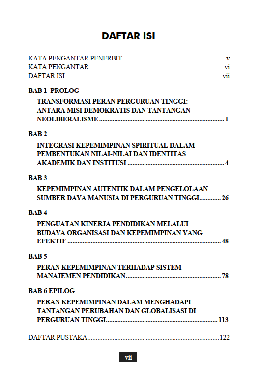 Berikut Daftar Isi Buku Pendidikan berjudul Buku Kepemimpinan Perguruan Tinggi: Menghadapi Transformasi, Tantangan, dan Inovasi dalam Era Globalisasi, diantaranya: