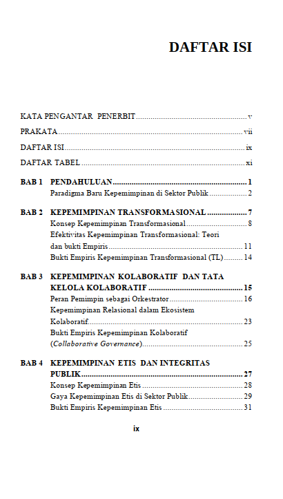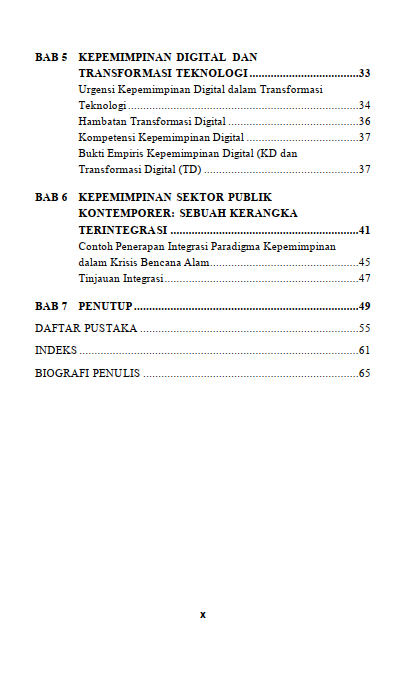 Konsep Kepemimpinan Sektor Publik Kontemporer yang diuraikan dalam buku ini menekankan pentingnya sinergi antara visi kebijakan, manajemen perubahan, dan penguatan kapasitas manusia dalam birokrasi modern. Pemimpin publik diharapkan mampu menjadi agen transformasi yang tidak hanya mengelola organisasi, tetapi juga menciptakan nilai tambah sosial dan membangun kepercayaan publik melalui inovasi berbasis data dan empati.