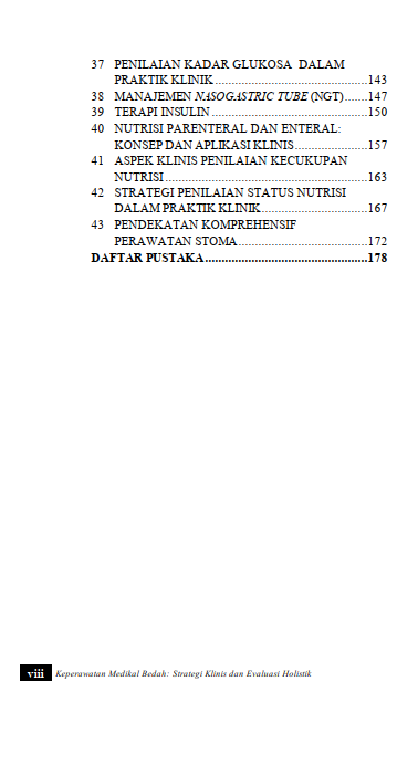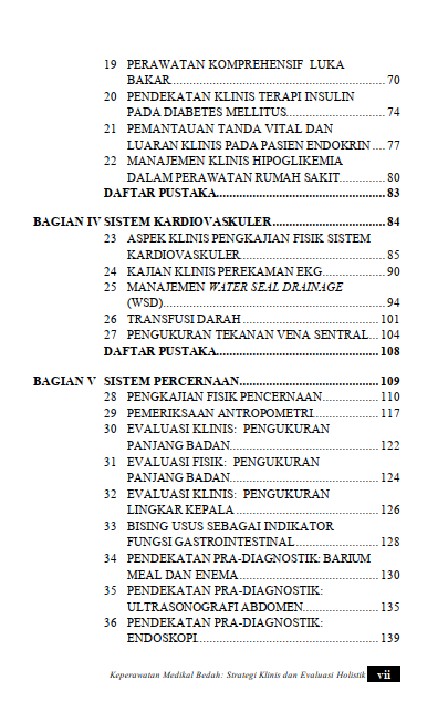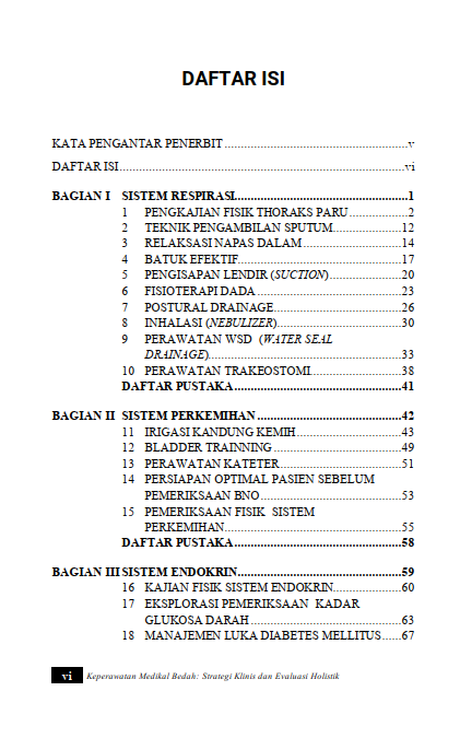 Isi buku ini mencakup penjelasan sistematis mengenai asuhan keperawatan pada berbagai sistem tubuh, meliputi: sistem respirasi dengan fokus pada gangguan pernapasan dan manajemen jalan napas; sistem perkemihan terkait fungsi ginjal dan tata laksana pasien dengan gagal ginjal atau infeksi saluran kemih; sistem endokrin yang membahas peran hormon serta keperawatan pada diabetes dan gangguan tiroid; sistem kardiovaskuler yang menyoroti penyakit jantung, hipertensi, hingga perawatan pasca operasi jantung; serta sistem pencernaan yang menguraikan peran perawat dalam menangani ulkus peptikum, hepatitis, hingga perawatan pasien dengan stoma.
