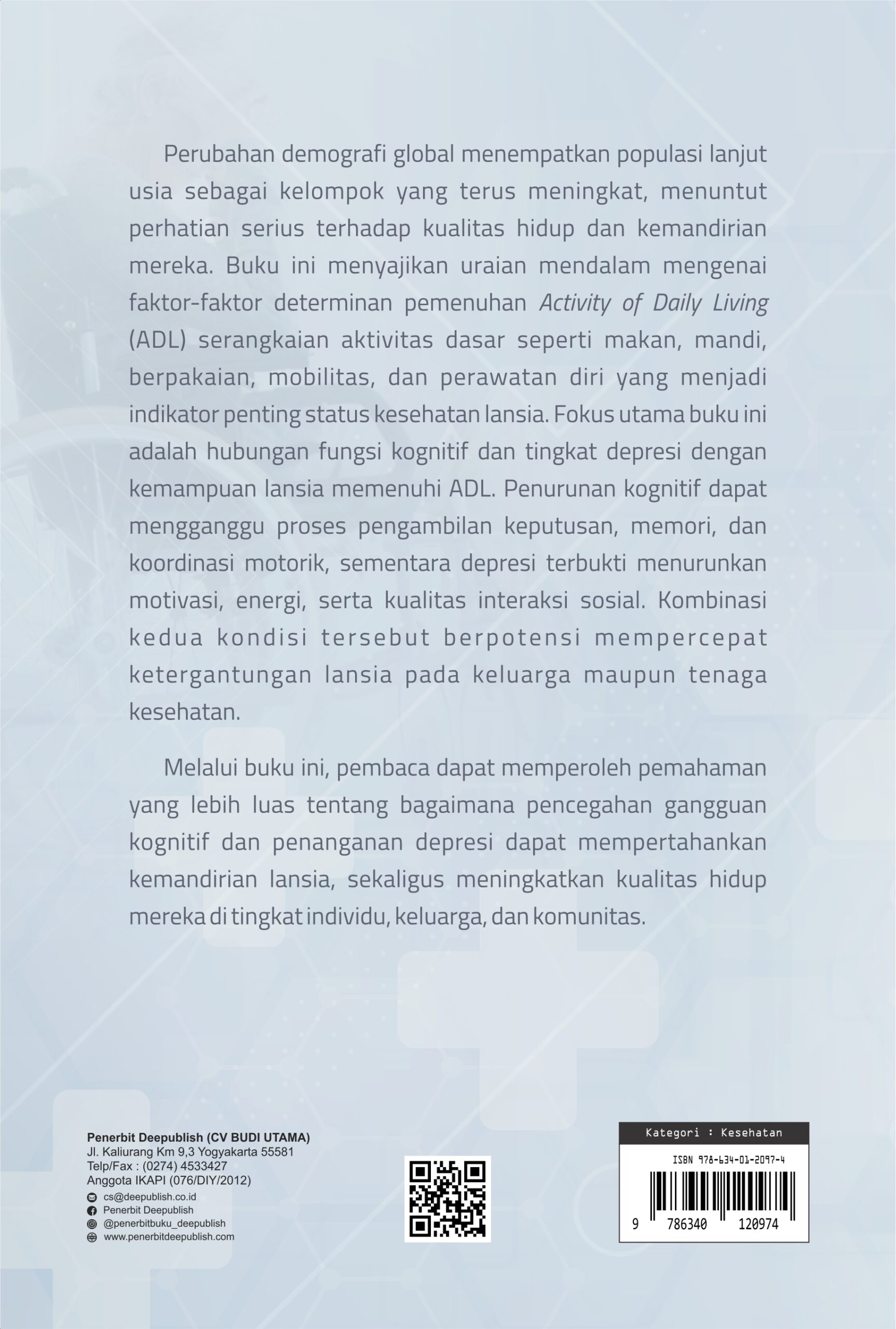 Buku Kesehatan Mental dan Kemandirian: Bagaimana Depresi Membentuk ADL Lansia diterbitkan oleh Penerbit Buku Pendidikan Deepublish.