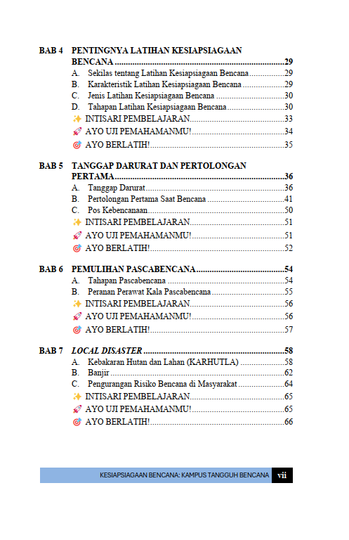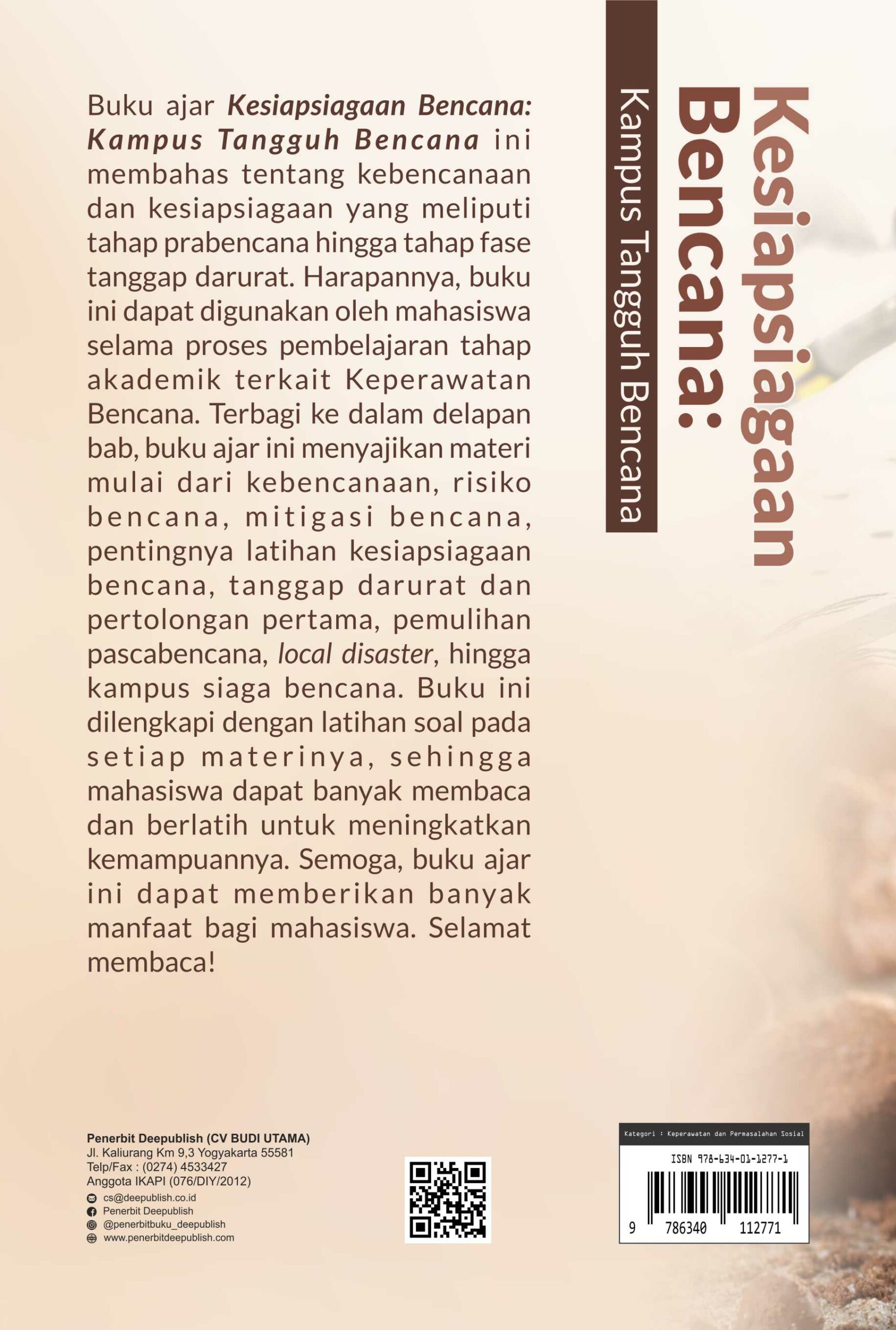 Sinopsis Buku Kesiapsiagaan Bencana: Kampus Tangguh Bencana Buku Kesiapsiagaan Bencana: Kampus Tangguh Bencana Buku Keperawatan yang berjudul Buku Kesiapsiagaan Bencana: Kampus Tangguh Bencana merupakan karya Mufimah, Ridlwan Kamaluddin dan Endang Triyanto. Bencana adalah peristiwa yang mengancam kehidupan manusia akibat faktor alam, non alam, atau sosial. Jenis bencana mencakup bencana alam (seperti gempa dan banjir), non-alam (seperti epidemi), dan sosial (seperti konflik). Penanggulangan bencana mencakup tahap pra-bencana, tanggap darurat, dan pasca-bencana. Institusi pendidikan berperan penting dalam kesiapsiagaan melalui kurikulum, edukasi, dan pelatihan. Penanggulangan bencana dapat didefinisikan sebagai segala upaya yang dilaksanakan dalam rangka pencegahan, mitigasi, kesiapsiagaan, tanggap darurat dan pemulihan yang berkaitan dengan tahapan sebelum bencana, saat bencana, dan setelah bencana. Penanggulangan bencana juga merupakan suatu proses yang melibatkan tiga unsur utama seperti pemerintah, masyarakat dan dunia usaha yang harus bekerja sama dalam usaha pencegahan suatu bencana. Dalam hal ini, mahasiswa tergolong dalam unsur masyarakat untuk melakukan pencegahan, mitigasi, kesiapsiagaan dan tanggap darurat. Buku ini membahas tentang kebencanaan dan kesiapsiagaan yang meliputi tahap prabencana hingga tahap fase tanggap darurat. Harapannya, buku ini dapat digunakan oleh mahasiswa selama proses pembelajaran tahap akademik terkait Keperawatan Bencana. Terbagi ke dalam delapan bab, buku ajar ini menyajikan materi mulai dari kebencanaan, risiko bencana, mitigasi bencana, pentingnya latihan kesiapsiagaan bencana, tanggap darurat dan pertolongan pertama, pemulihan pascabencana, local disaster, hingga kampus siaga bencana. Buku ini dilengkapi dengan latihan soal pada setiap materinya, sehingga mahasiswa dapat banyak membaca dan berlatih untuk meningkatkan kemampuannya. Buku Kesiapsiagaan Bencana: Kampus Tangguh Bencana sangat cocok bagi para peneliti, mahasiswa, dan praktisi di bidang keperawatan, ilmu lingkungan, geografi, teknik geologi, teknik sipil yang ingin mendalami tentang keperawatan bencana. Berikut Daftar Isi Buku Keperawatan yang berjudul Buku Kesiapsiagaan Bencana: Kampus Tangguh Bencana, diantaranya: