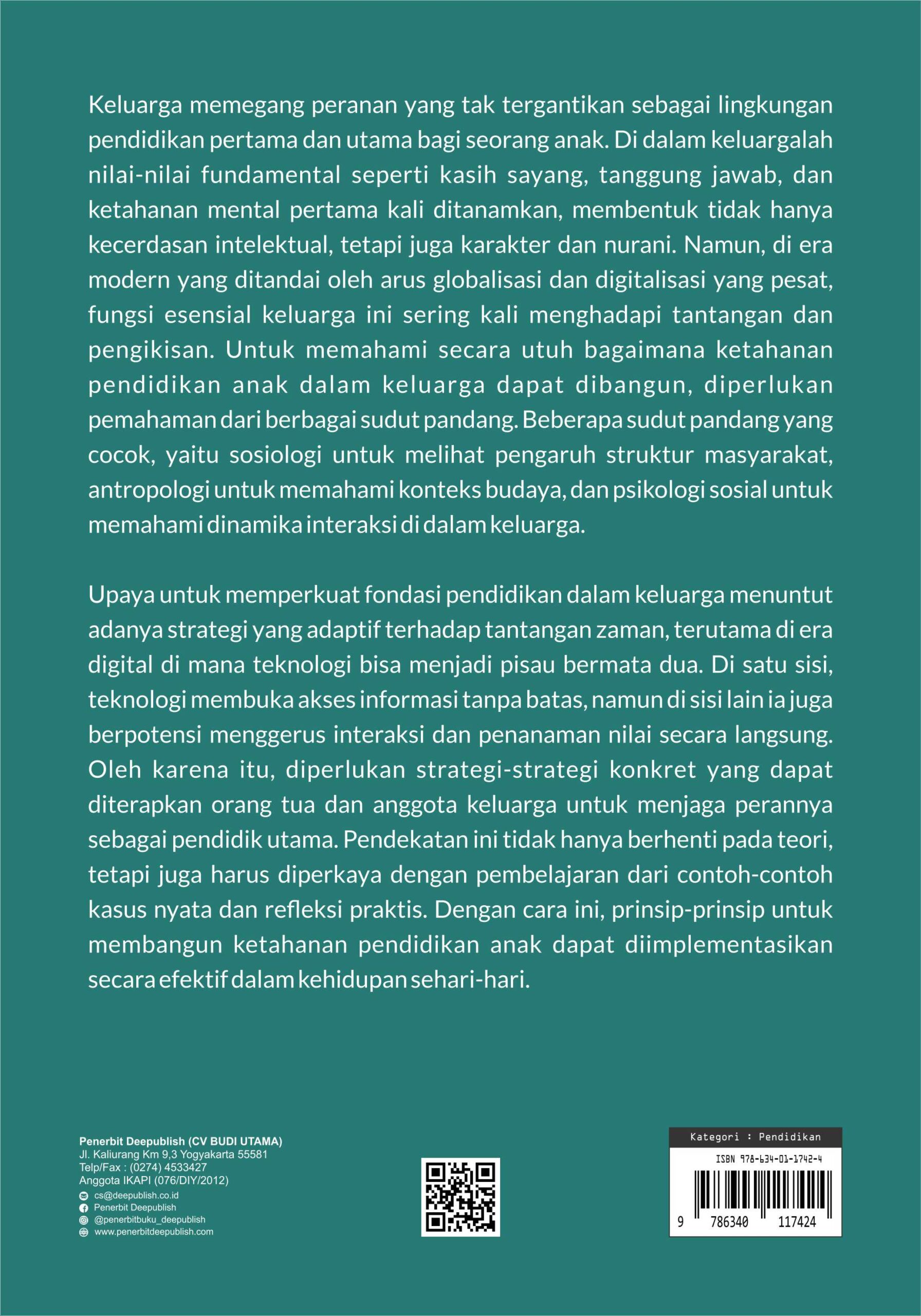 Upaya untuk memperkuat fondasi pendidikan dalam keluarga menuntut adanya strategi yang adaptif terhadap tantangan zaman, terutama di era digital di mana teknologi bisa menjadi pisau bermata dua. Di satu sisi, teknologi membuka akses informasi tanpa batas, namun di sisi lain ia juga berpotensi menggerus interaksi dan penanaman nilai secara langsung. Oleh karena itu, diperlukan strategi-strategi konkret yang dapat diterapkan orang tua dan anggota keluarga untuk menjaga perannya sebagai pendidik utama. Pendekatan ini tidak hanya berhenti pada teori, tetapi juga harus diperkaya dengan pembelajaran dari contoh-contoh kasus nyata dan refleksi praktis. Dengan cara ini, prinsip-prinsip untuk membangun ketahanan pendidikan anak dapat diimplementasikan secara efektif dalam kehidupan sehari-hari. Buku Ketahanan Pendidikan Anak dalam Keluarga: Tinjauan Multidisiplin Sosiologi, Antropologi, dan Psikologi Sosial sangat cocok menjadi bahan bacaan akademik, juga sumber renungan bagi para pendidik, orang tua, dan siapa pun yang peduli pada masa depan anak bangsa. Semoga setiap halaman dalam buku ini dapat menjadi cahaya kecil yang menerangi jalan menuju keluarga yang tangguh, berpendidikan, dan berkarakter luhur.