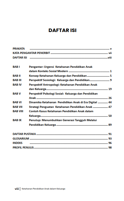 Berikut Daftar Isi Buku Pendidikan yang berjudul Buku Ketahanan Pendidikan Anak dalam Keluarga: Tinjauan Multidisiplin Sosiologi, Antropologi, dan Psikologi Sosial, diantaranya: