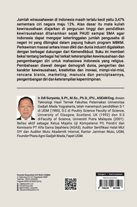 Buku Kewirausahaan yang berjudul Kewirausahaan dan Pengembangan Diri (Entrepreneurship & Personal Development) merupakan karya Edi Suryanto. Jumlah wirausahawan di Indonesia masih terlalu kecil yaitu 3,47% sementara ciri negara maju 12%. Atas dasar itu mata kuliah kewirausahaan diajarkan di perguruan tinggi dan pendidikan kewirausahaan ditanamkan sejak PUD sampai SMA agar Indonesia dapat mengejar ketertinggalan jumlah pengusaha di negeri ini yang dibingkai dalam payung hukum porgram MBKM. Perkawinan massal antara insan dikti dan dunia industri digalakkan dengan berbagai dukungan dari Kemendikbud. Buku ini memberi bekal tentang berbagai hal terkait keterampilan kewirausahaan dan pengembangan diri untuk mahasiswa Indonesia yang religius. Pembahasan diawali dengan demografi dunia, pengerian dan karakter kewirausahaan, kreativitas dan inovasi, mimpi-visi-misi, rencana bisnis, marketing, manusia dan penciptaannya, pengembangan diri dan keterampilan kepemimpinan.