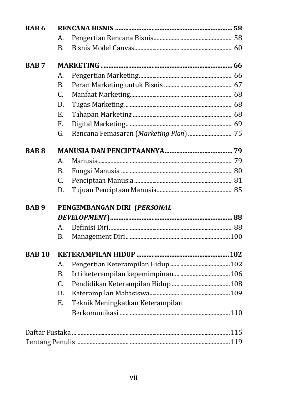 Buku ini merupakan bagian dari pendidikan pengembangan kepribadian yang sangat dibutuhkan untuk mengasah IQ, EQ, SQ dan FinQ secara bersama-sama sehingga memberi keterampilan hidup yang lebih baik di tengah-tengah masyarakat. Dalam buku ini akan dibahas mengenai motivasi kewirausahaan, visi dan misi kewirausahaan, rencana bisnis, pengembangan bisnis, bisnis model canvas, bauran pemasaran, pemasaran digital dan konsumen; ide bisnis, rencana bisnis dan pembuatannya; penciptaan manusia dan tujuan hidup; diri (personal) dan pengembangannya; keterampilan hidup; dan keterampilan kepemimpinan.