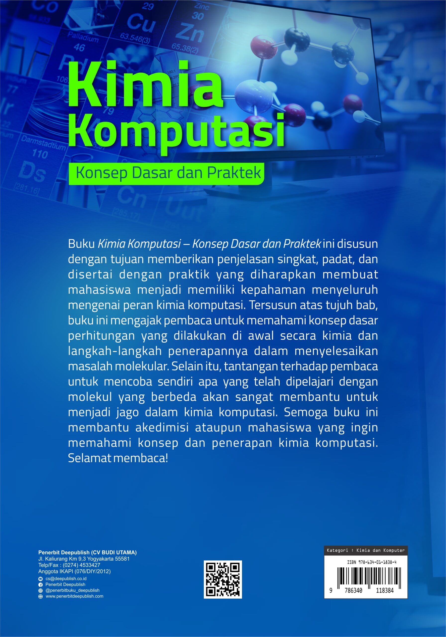 Buku Kimia Komputasi Konsep Dasar dan Praktek merupakan karya Yuly Kusumawati dan Badrut Tamam Ibnu Ali. Tantangan perkembangan teknologi saat ini diperlukan untuk mengatasi berbagai kebutuhan-kebutuhan di berbagai bidang. Penelitian di bidang sains dituntut untuk terus berkembang pula, sehingga dapat mengimbangi dan menjawab kebutuhan teknologi. Hal ini menuntut penguatan konsep dasar yang kuat. Ilmu komputasi hadir dan diperlukan untuk memperkuat kerangka dasar pada setiap perkembangan ilmu pengetahuan. Kimia komputasi memberikan landasan konseptual dan metodologis bagi kimiawan untuk menjembatani model matematis dengan realitas kimia. Dengan menggunakan hukum-hukum mekanika kuantum dan prinsip termodinamika, kimia komputasi mampu menghasilkan gambaran energi, struktur, dan dinamika molekul. Hasil komputasi ini seringkali menjadi panduan awal sebelum dilakukan eksperimen, sehingga dapat menghemat waktu, biaya, dan sumber daya. Bahkan, untuk sistem-sistem yang sulit diobservasi secara langsung seperti reaksi transien, molekul tidak stabil, atau material baru, kimia komputasi menawarkan cara untuk memperoleh pemahaman yang lebih mendalam.