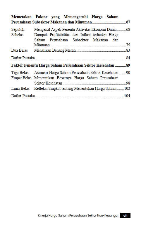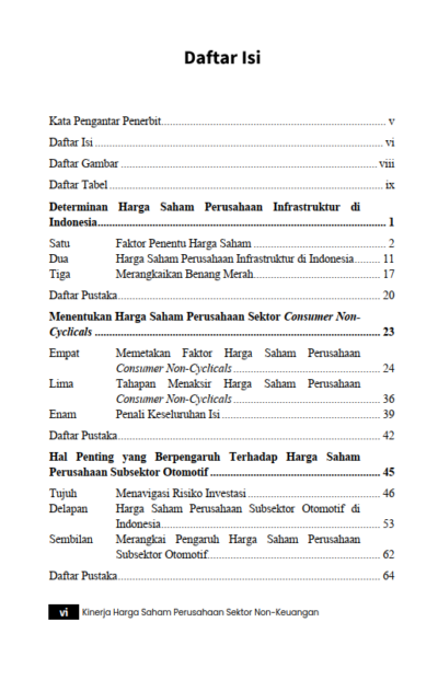 Buku ini membahas faktor penentu harga saham di pasar saham Indonesia, khususnya yang berfokus kepada sektor infrastruktur, consumer non-cyclicals, subsektor otomotif, makanan dan minuman, serta perawatan kesehatan. Ditekankan di dalam buku ini bahwa harga saham memiliki kaitan atau korelasi yang erat dengan likuiditas, solvabilitas, dan profitabilitas, sekaligus memanfaatkan analisis statistik dan teknik regresi untuk menunjukkan pengaruh tersebut. Teori-teori utama, seperti Teori Pensinyalan, memberikan konteks tambahan tentang mengenai bagaimana rasio kinerja keuangan memengaruhi harga saham.