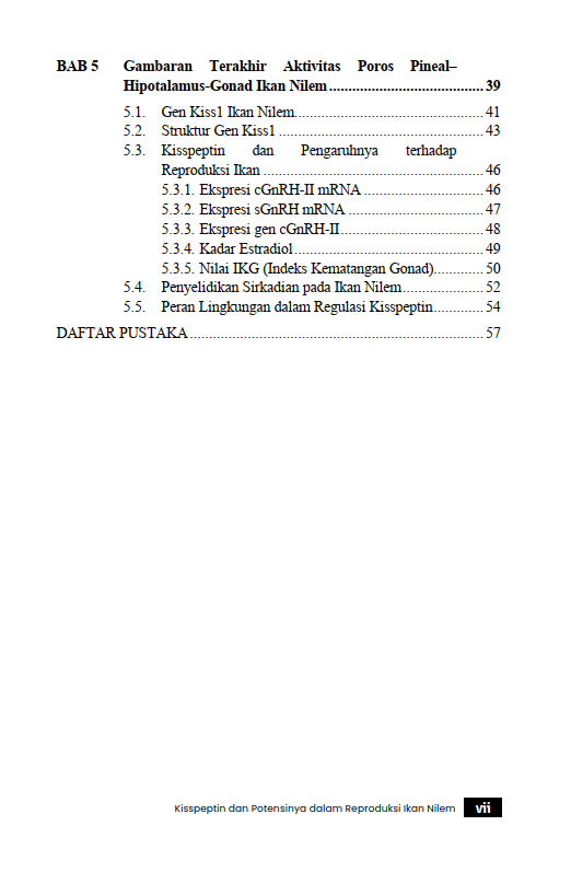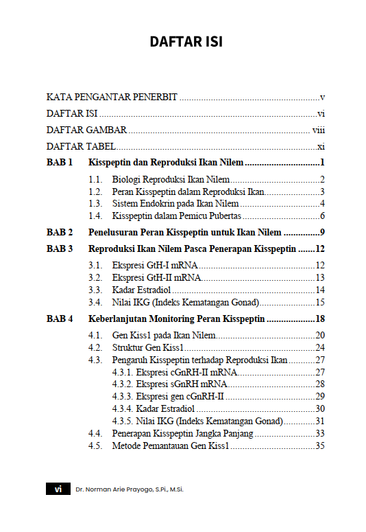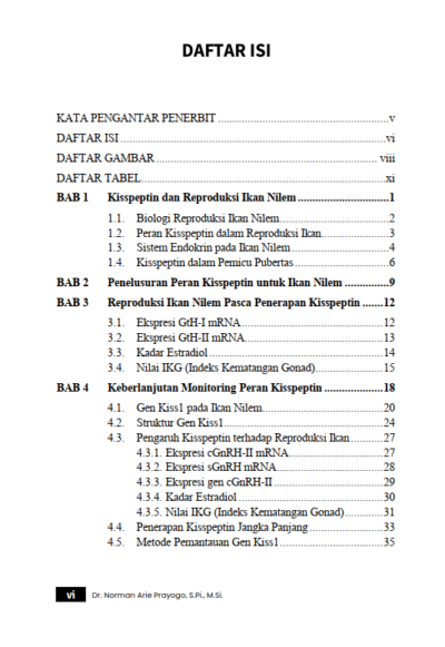 Berikut Daftar Isi Buku Perikanan berjudul Buku Kisspeptin dan Potensinya dalam Reproduksi Ikan Nilem, diantaranya: