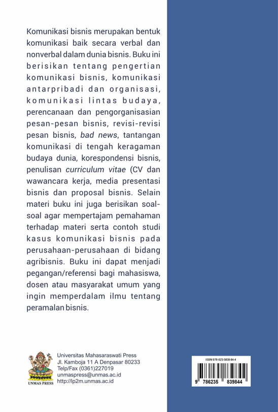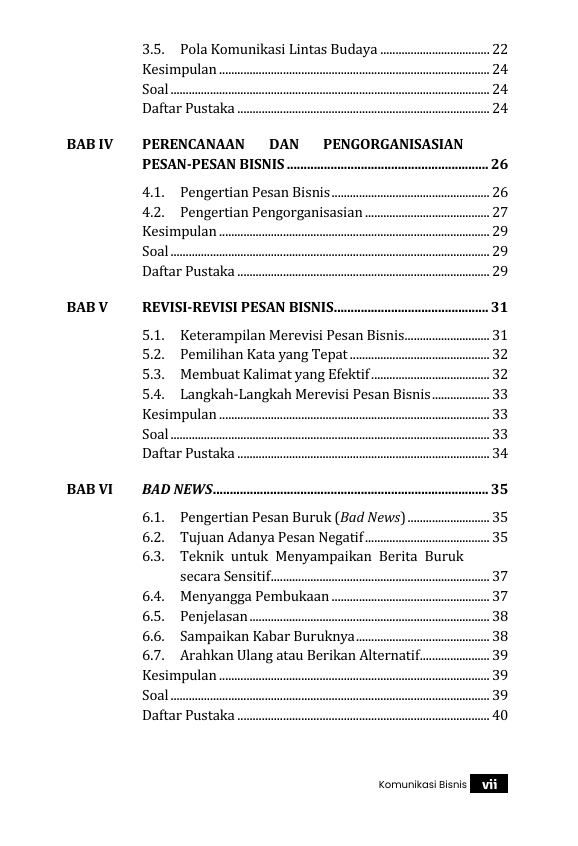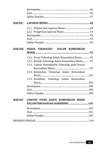 Selain itu, pengirim pesan memerlukan media yang efisien untuk dapat menjangkau audiens serta mendengarkan umpan balik untuk perbaikan. Buku ini berisikan tentang pengertian komunikasi bisnis, komunikasi antarpribadi dan organisasi, komunikasi lintas budaya, perencanaan dan pengorganisasian pesan-pesan bisnis, revisi-revisi pesan bisnis, bad news, tantangan komunikasi di tengah keragaman budaya dunia, korespondensi bisnis, penulisan curriculum vitae (CV dan wawancara kerja, media presentasi bisnis dan proposal bisnis. Selain materi buku ini juga berisikan soal-soal agar mempertajam pemahaman terhadap materi serta contoh studi kasus komunikasi bisnis pada perusahaan-perusahaan di bidang agribisnis.