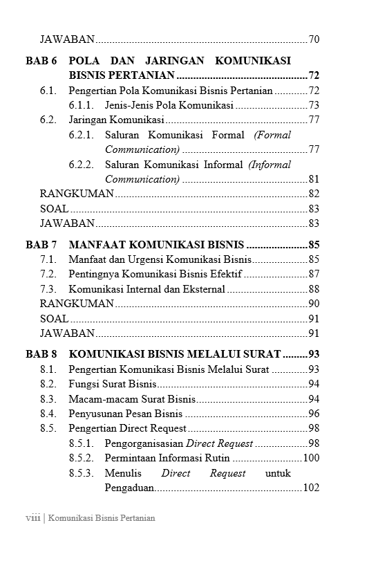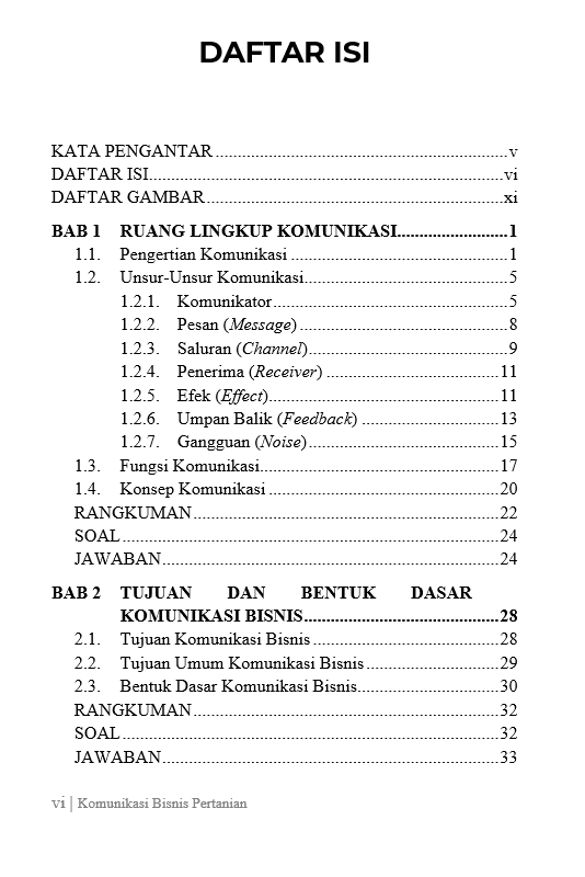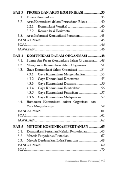 Sinopsis Buku Komunikasi Bisnis Pertanian Buku Komunikasi Bisnis Pertanian Buku Pertanian yang berjudul Buku Komunikasi Bisnis Pertanian merupakan karya Ni Gst.Ag.Gde Eka Martiningsih dan Putu Fajar Kartika Lestari. Buku ini membahas pentingnya komunikasi dalam interaksi sosial, khususnya antara petani dan penyuluh. Hambatan komunikasi, atau noise, sering kali menghalangi penyampaian pesan yang efektif. Buku ini menawarkan solusi untuk membangun kepercayaan melalui peningkatan kompetensi komunikator, menciptakan iklim komunikasi kondusif, melibatkan aktor informal, dan menerapkan komunikasi interpersonal. Pemahaman akan preferensi dan kondisi sosial budaya petani menjadi kunci keberhasilan komunikasi. Buku ini penting bagi penyuluh, petani, dan praktisi komunikasi pertanian. Komunikasi sangat penting dalam kehidupan bersosial karena tanpa komunikasi yang baik kegiatan sosial tidak akan berjalan dengan semestinya. Namun ketika komunikasi yang mengharapkan suatu timbal balik yang baik terkadang kita tidak bisa mendapatkan timbal balik yang positif, karena ada suatu noise di dalam komunikasi tersebut. Yang akhirnya menyebabkan suatu makna pesan tidak tersampaikan secara sempurna. Untuk meningkatkan saling percaya antara petani dan penyuluh adalah dengan cara meningkatkan kompetensi komunikator, menciptakan iklim komunikasi yang kondusif, melibatkan aktor-aktor informal, dan melakukan komunikasi interpersonal. Perlu adanya kondisi di mana penyuluh bisa memosisikan diri sebagai petani dan sebaliknya. Proses saling menghargai dan memberikan kesempatan inilah yang kemudian bisa memupuk lahirnya kepercayaan di antara penyuluh dan petani. Kompetensi yang dimiliki penyuluh akan berpengaruh terhadap motivasi kerja. Penyuluh dalam melakukan komunikasi dengan petani harus memahami pesan apa saja yang disukai petani, apa yang tidak dikehendaki, bagaimana kondisi sosial budaya yang ada dan kebiasaan-kebiasaan komunikasi seperti apa yang sering dilakukan di daerah tersebut. Berikut Daftar Isi Buku Pertanian yang berjudul Buku Komunikasi Bisnis Pertanian, diantaranya: