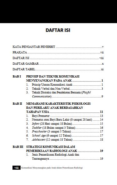 Berikut Daftar Isi Buku Kesehatan yang berjudul Buku Komunikasi Menyenangkan pada Anak dalam Pemeriksaan Radiologi, diantaranya: