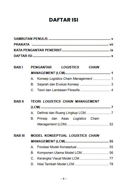 Melalui buku ini, penulis memperkenalkan sebuah kerangka baru yang disebut Logistics Chain Management (LCM) sebuah pendekatan manajerial yang memandang logistik sebagai ekosistem kolaboratif yang mengintegrasikan aktor, aliran barang, informasi, keuangan, teknologi, tata kelola, dan nilai keberlanjutan dalam satu arsitektur sistemik.