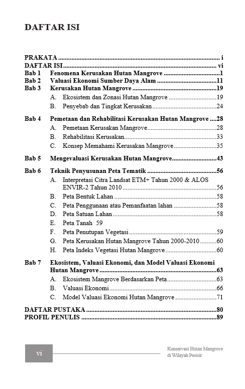 Berikut Daftar Isi Buku Kehutanan yang berjudul Buku Konservasi Hutan Mangrove di Wilayah Pesisir (Pendekatan Valuasi Ekonomi dan Pemetaan dari Fungsi Ekologis-Lingkungan), diantaranya: