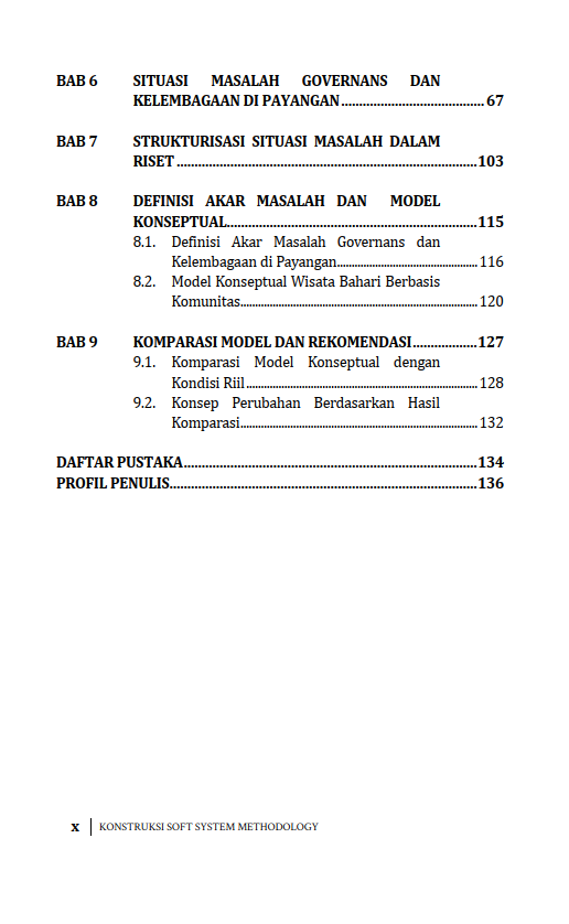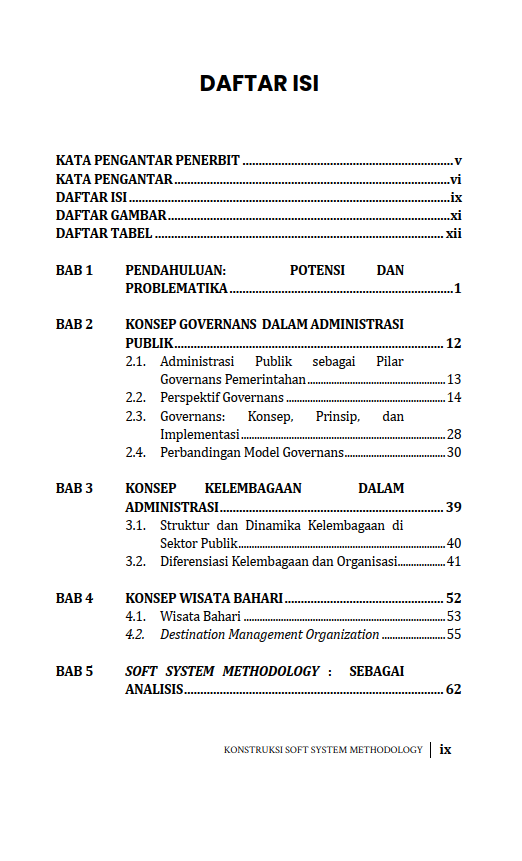Berikut Daftar Isi Buku Sosial dan Politik yang berjudul Buku Konstruksi Soft System Methodology dalam Model Governansi dan Kelembagaan Wisata Bahari Berbasis Komunitas, diantaranya: