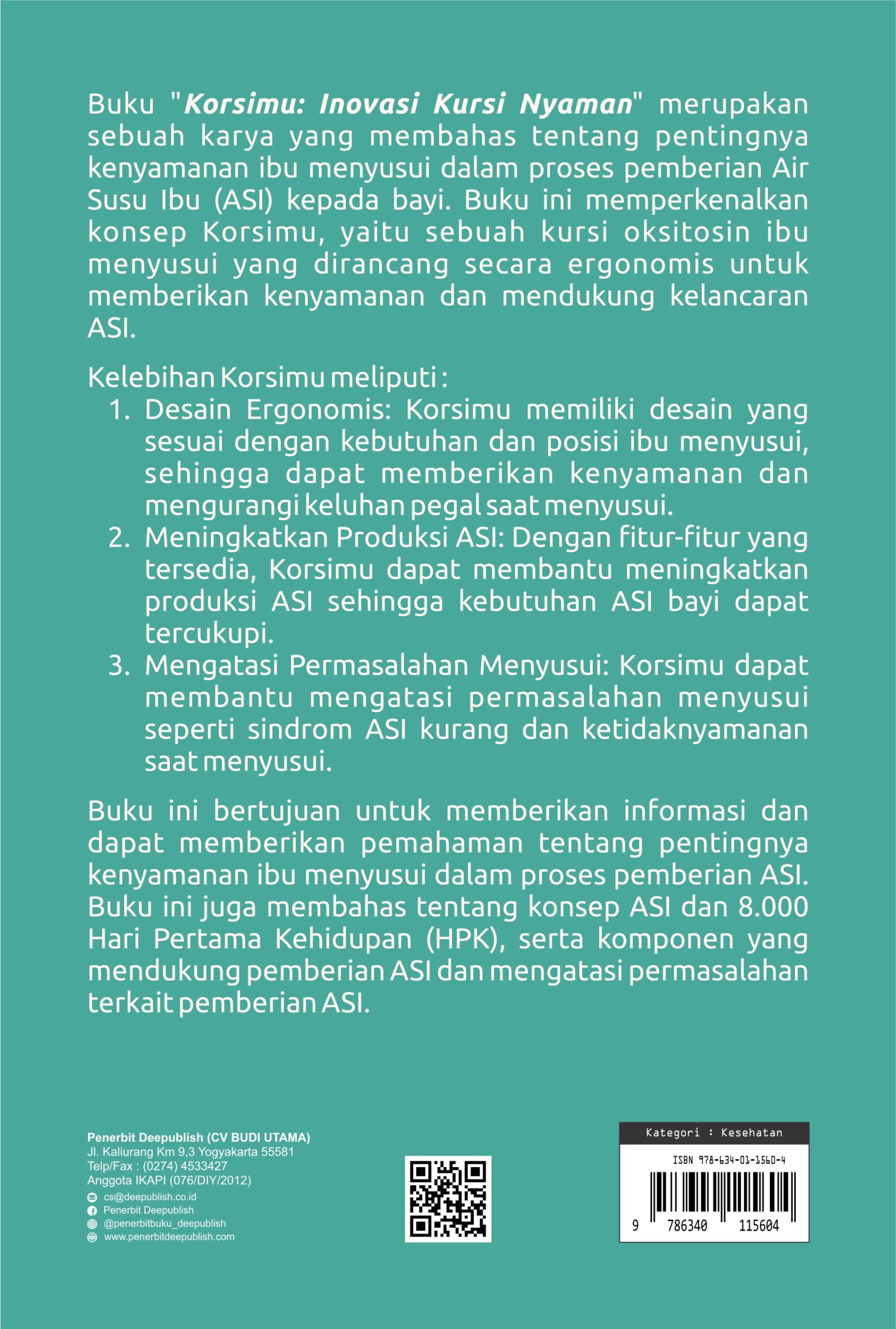Buku Korsimu: Inovasi Kursi Nyaman untuk Mendukung Kesehatan Ibu Menyusui diterbitkan oleh Penerbit Buku Pendidikan Deepublish.