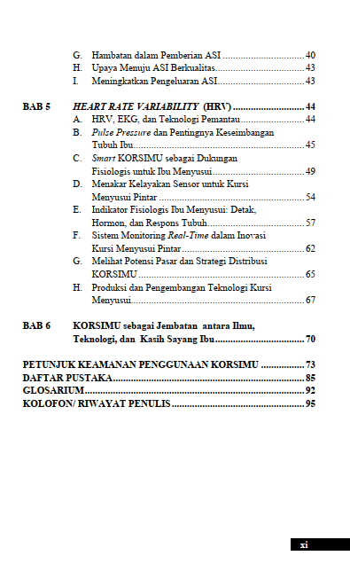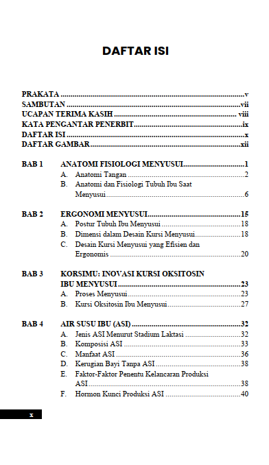 Berikut Daftar Isi Buku Kesehatan yang berjudul Buku Korsimu: Inovasi Kursi Nyaman untuk Mendukung Kesehatan Ibu Menyusui, diantaranya:
