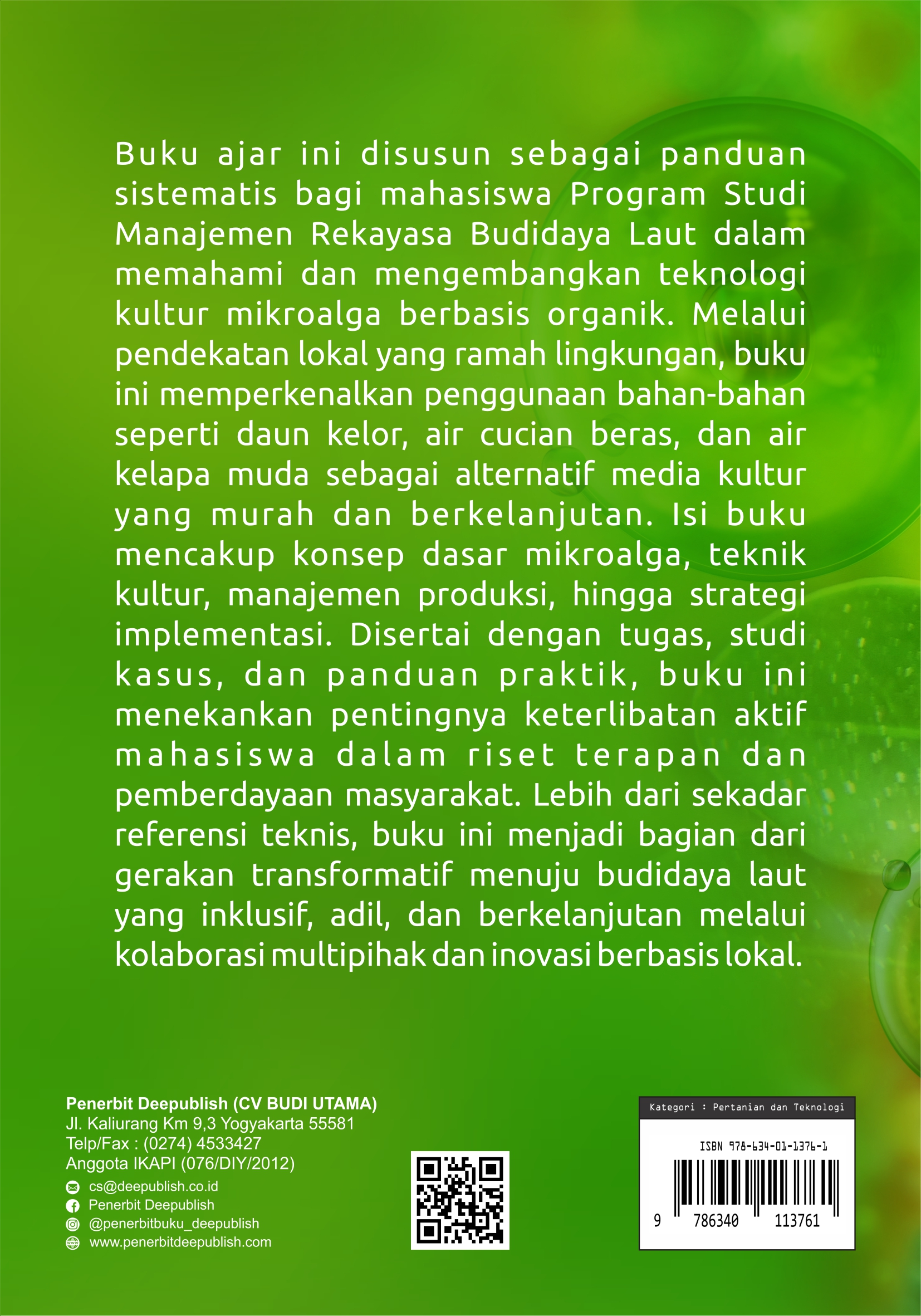 Buku Kultur Mikroalga Organik: Teknologi Tepat Guna untuk Budidaya Laut Berkelanjutan diterbitkan oleh Penerbit Buku Pendidikan Deepublish.